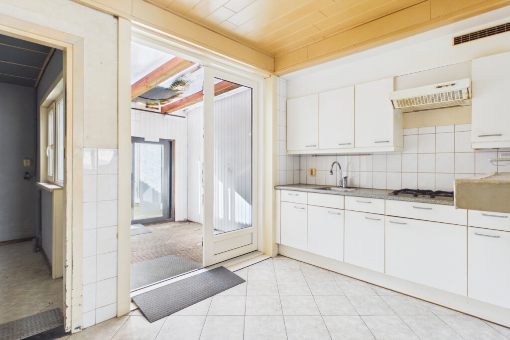 Je komt binnen in de hal met de meterkast en de trapopgang naar de verdieping. Vanuit hier loop je door naar de woonkamer. Halverwege bevindt zich een gezellige bar, met daarachter de compacte keuken. De keuken is voorzien van inbouwapparatuur, maar kan wel een moderniseringsslag gebruiken. Vanuit de keuken is er toegang tot de serre, de bijkeuken met witgoedaansluiting en een praktische provisiekast onder de trap. In de bijkeuken bevindt zich daarnaast het toilet.