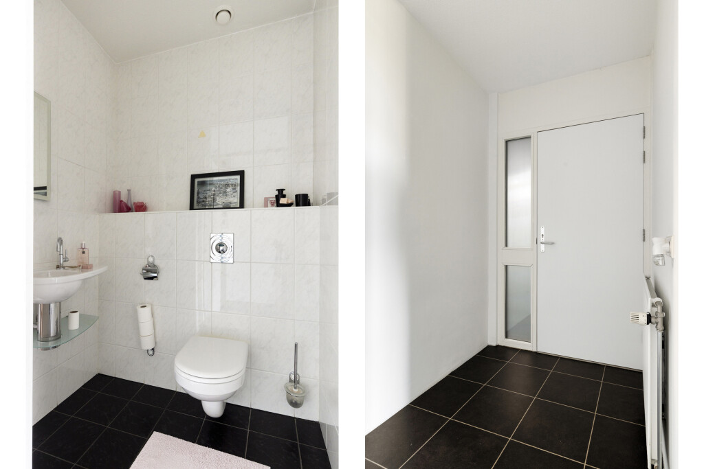 Het toilet is geheel betegeld en voorzien van een hangtoilet en fonteintje. De garderobekast is voorzien van water aansluiting en afvoer(voormalig 2e toiletruimte) waardoor deze ruimte eenvoudig is aan te passen voor een wasruimte of tweede badkamer/doucheruimte.