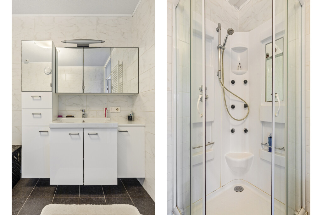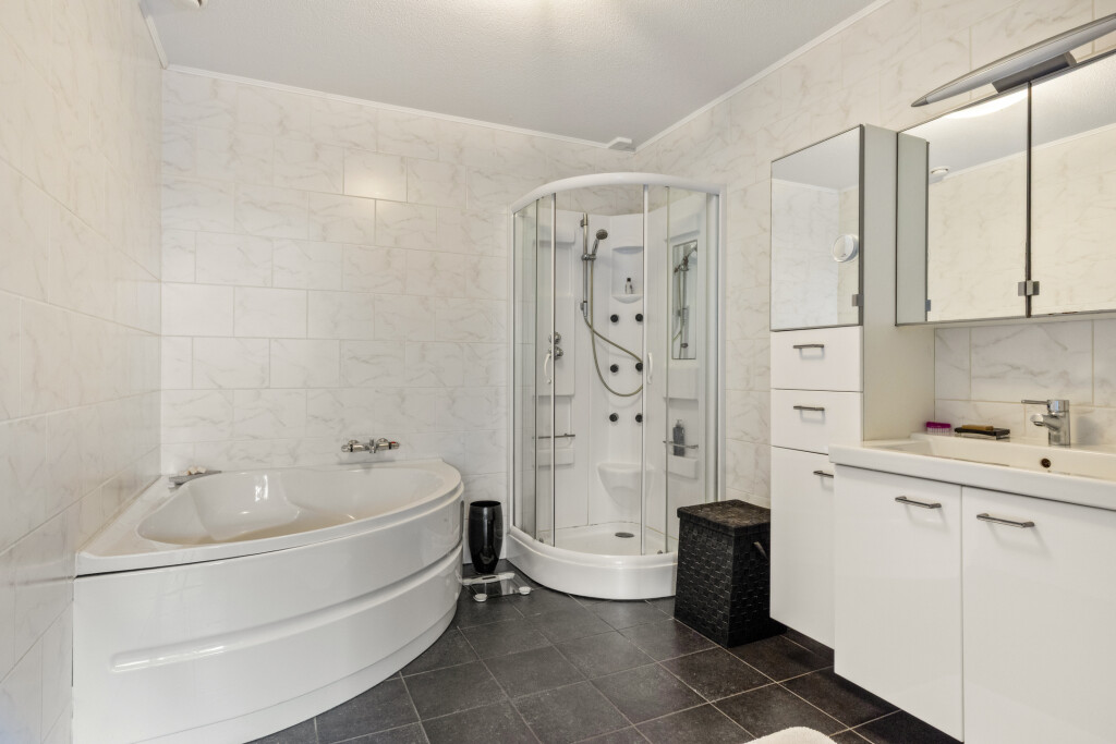 De badkamer is geheel betegeld en beschikt over een ligbad, een douchecabine, een wastafel met bijbehorend meubel en een designradiator.