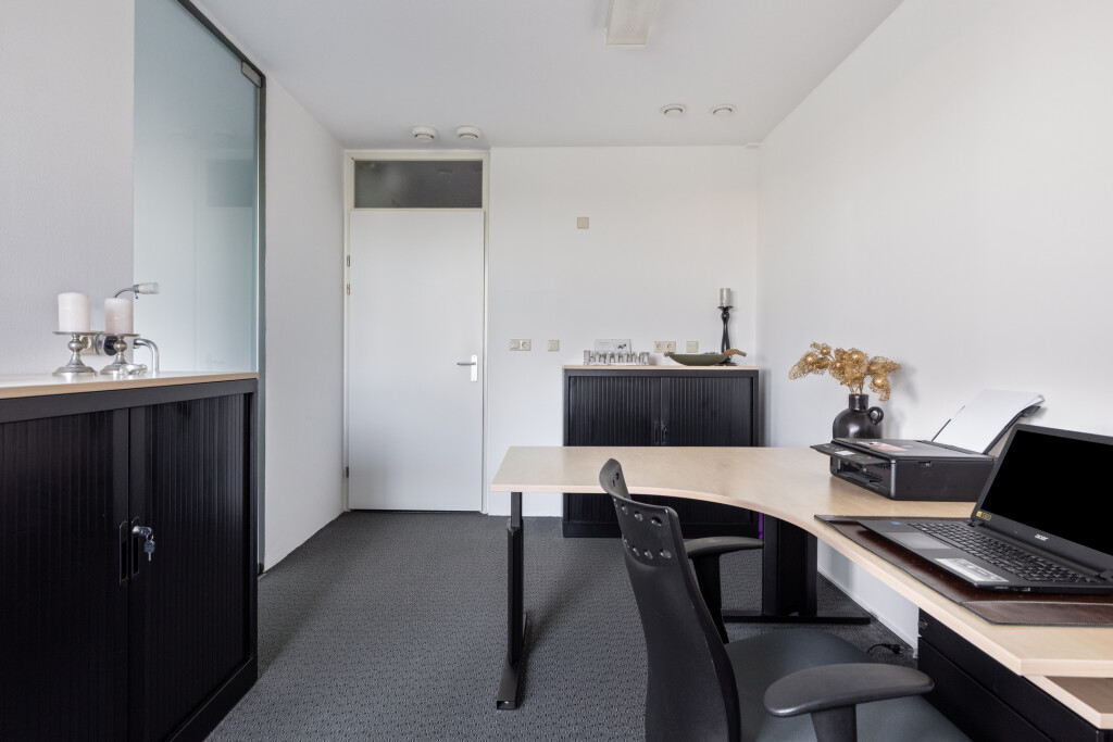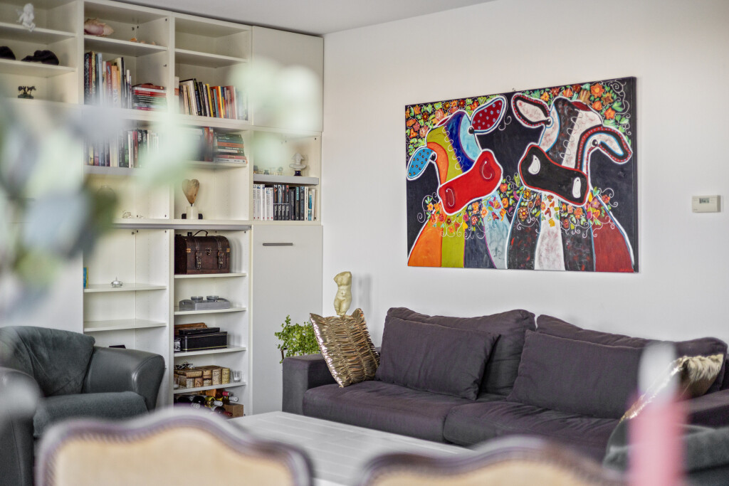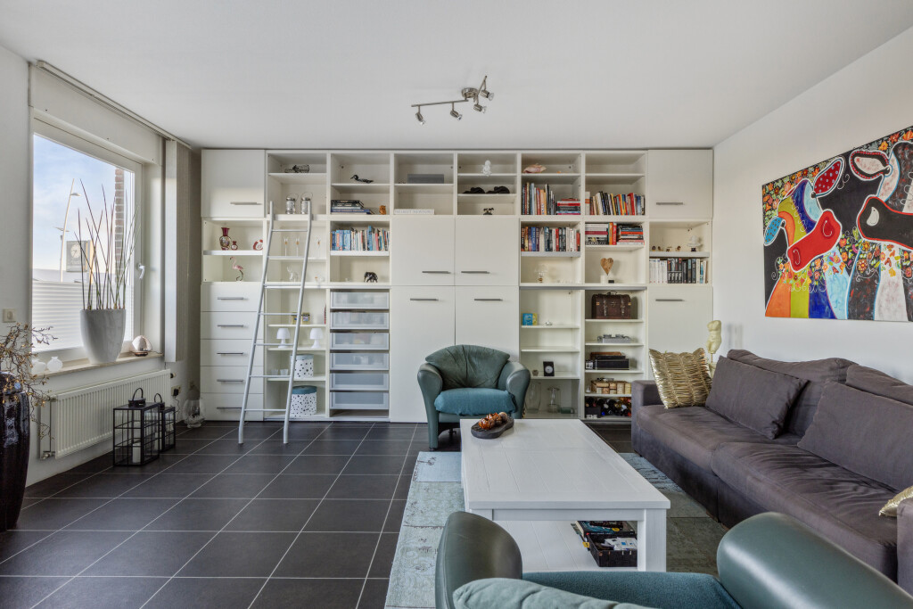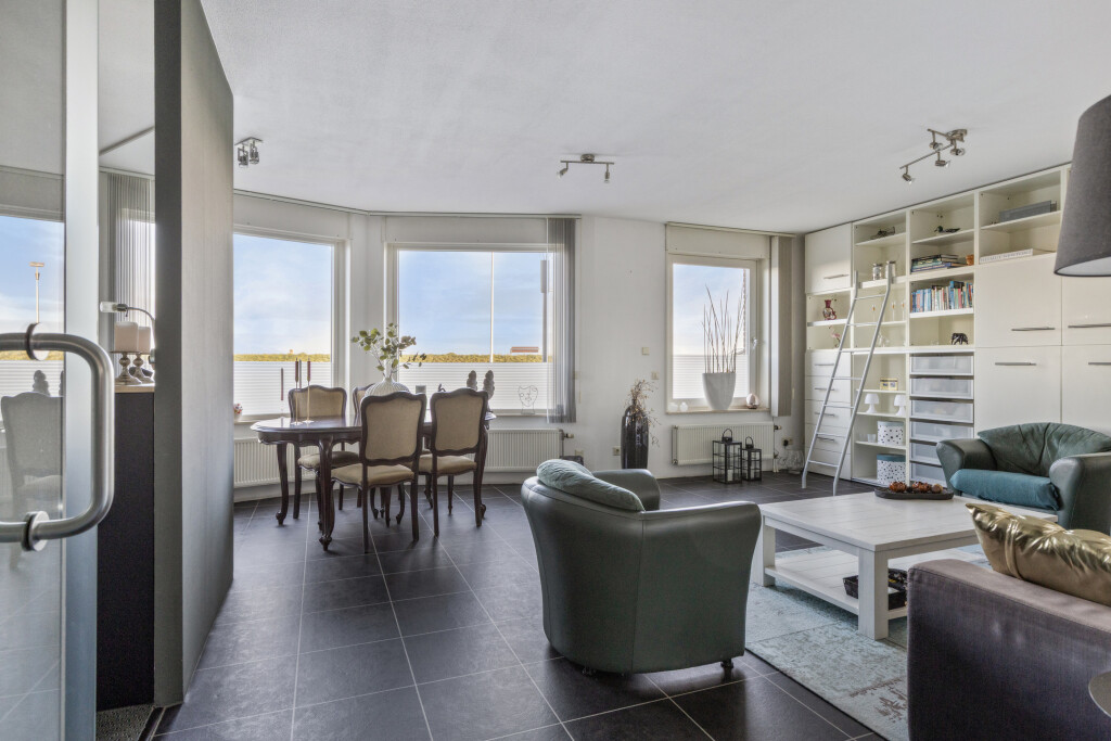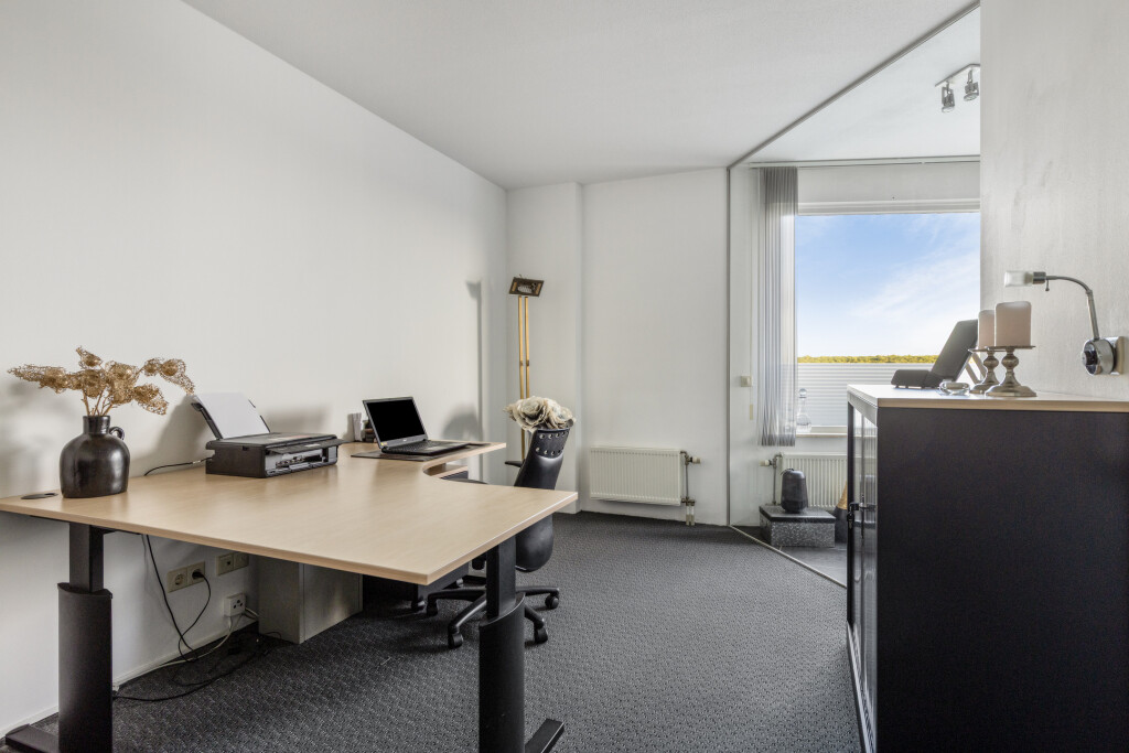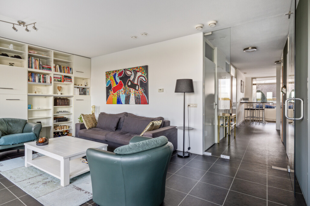 De royale woonkamer (ca. 28 m²) bevindt zich over de gehele breedte van het appartement en is voorzien van een novilonvloer en aansluitend een kantoorruimte, welke ideaal kan dienen als hobbykamer of thuiswerkplek. Het kantoor is voorzien van vloerbedekking en een glazen wand die voor veel lichtinval zorgt.