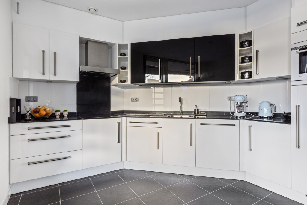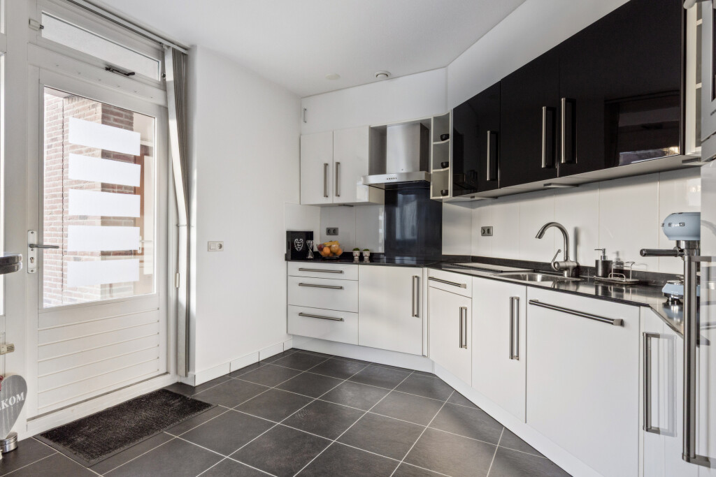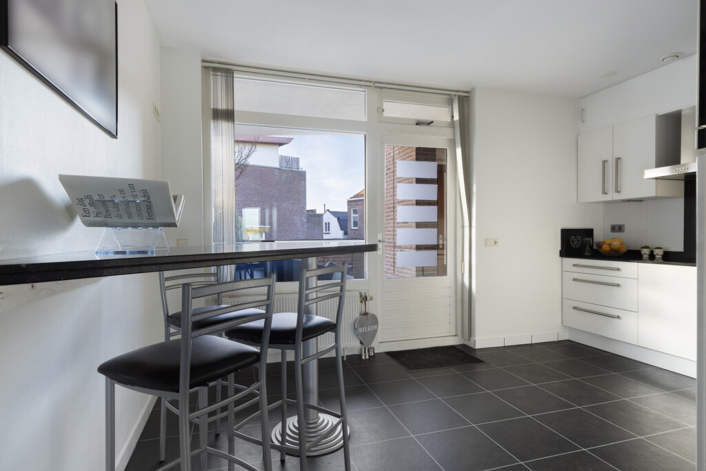 De half open keuken is aan de achterzijde gelegen, ruim van formaat, oogt heel licht door het grote raam aan de zuidkant en diverse inbouwapparatuur: