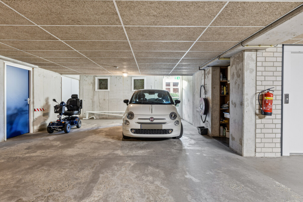 In de afgesloten parkeerkelder is een eigen parkeerplaats van 290*550 cm en een afgesloten berging van 5,5 m².