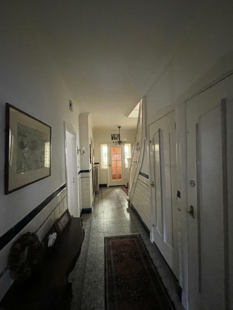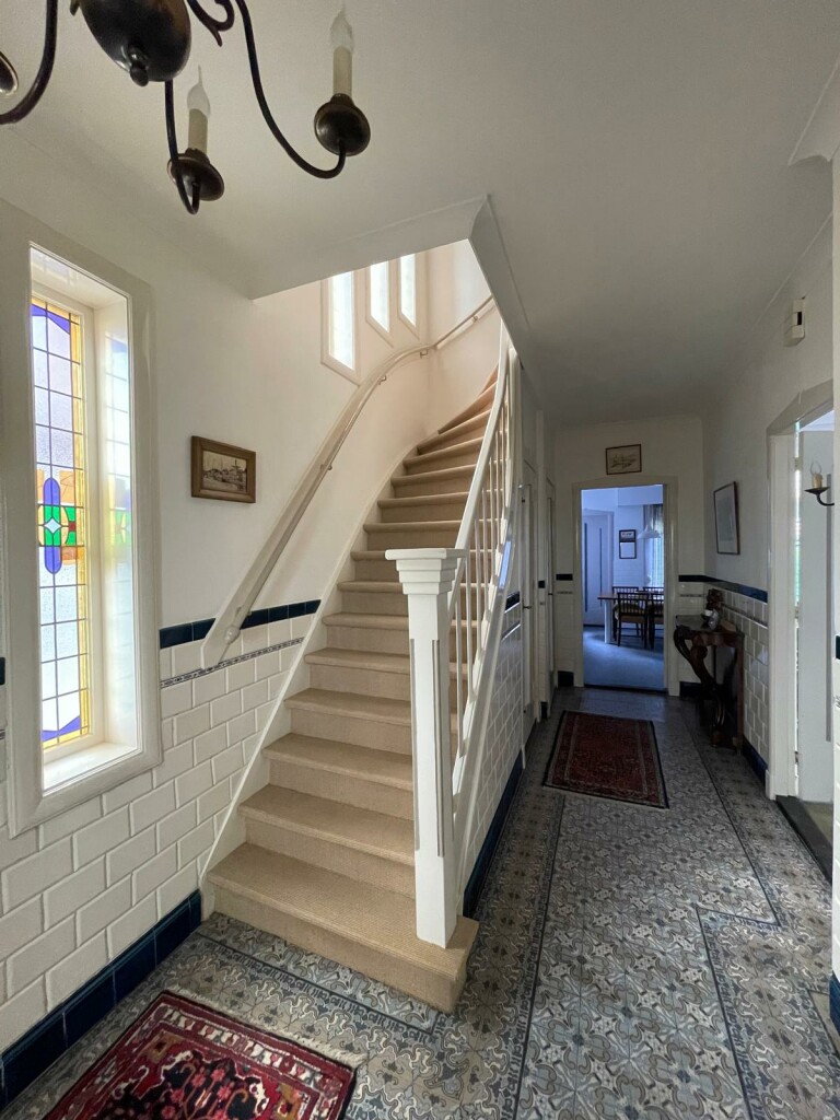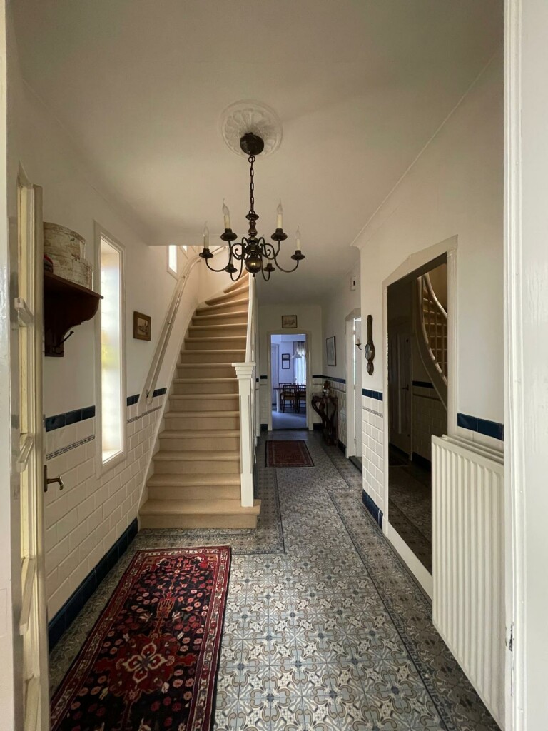 entree/ tochtportaal, gang met originele tegelvloer, vernieuwde meterkast, garderobe, toilet en trap naar de verdieping,