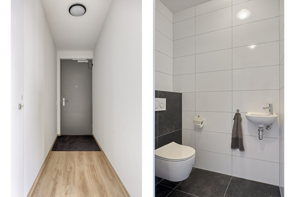 Hal met meterkast en gastentoilet en toegang tot een heerlijk zonnig terras.