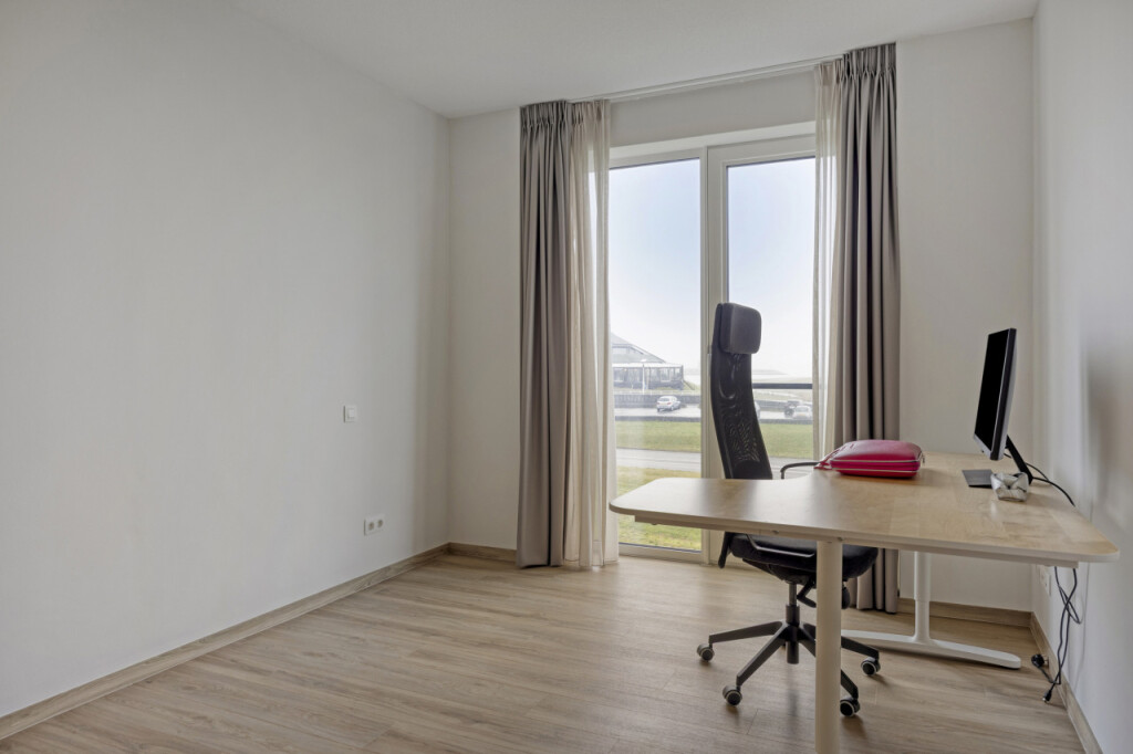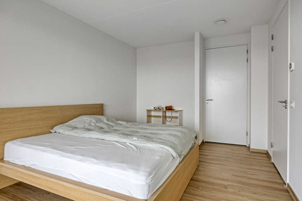 De ruime tweede slaapkamer is aan de zuidzijde gelegen en geeft via de schuifpui direct toegang tot het terras.