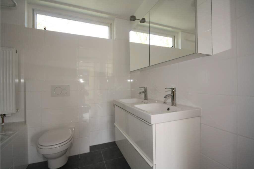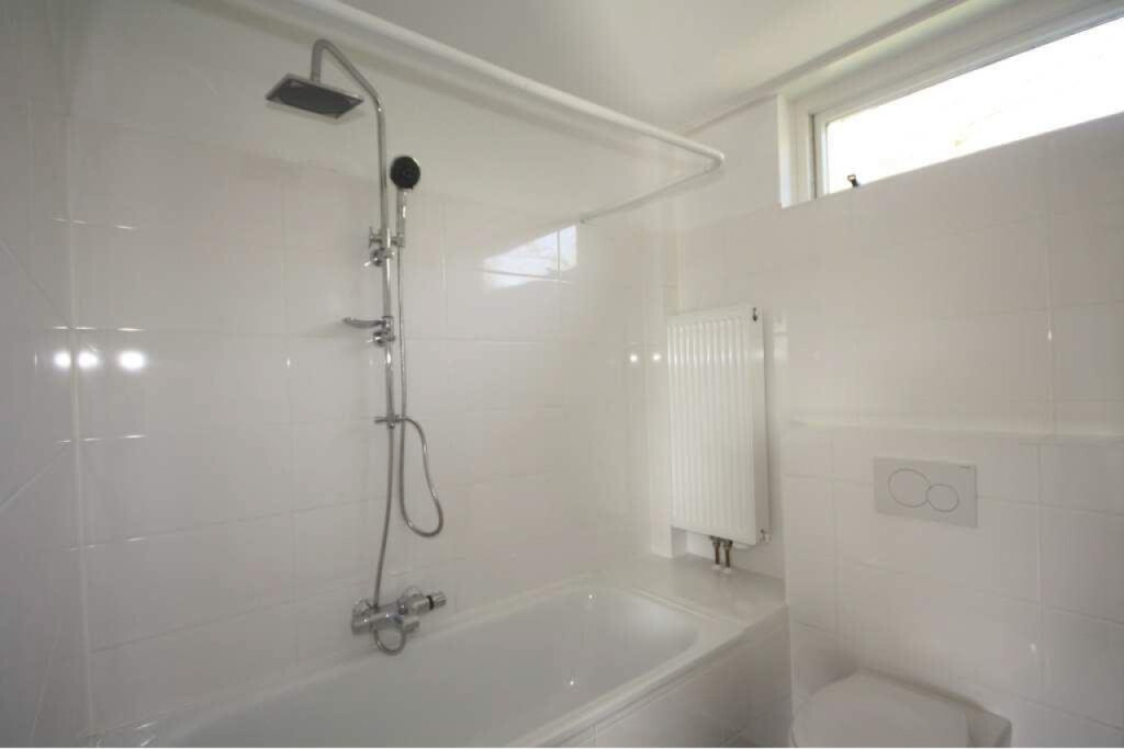 Overloop met vaste trap naar de zolder, 3 ruime slaapkamers en een moderne badkamer met ligbad (douchefunctie), toilet en wastafelmeubel.