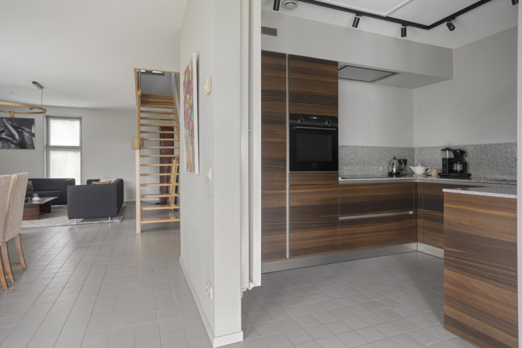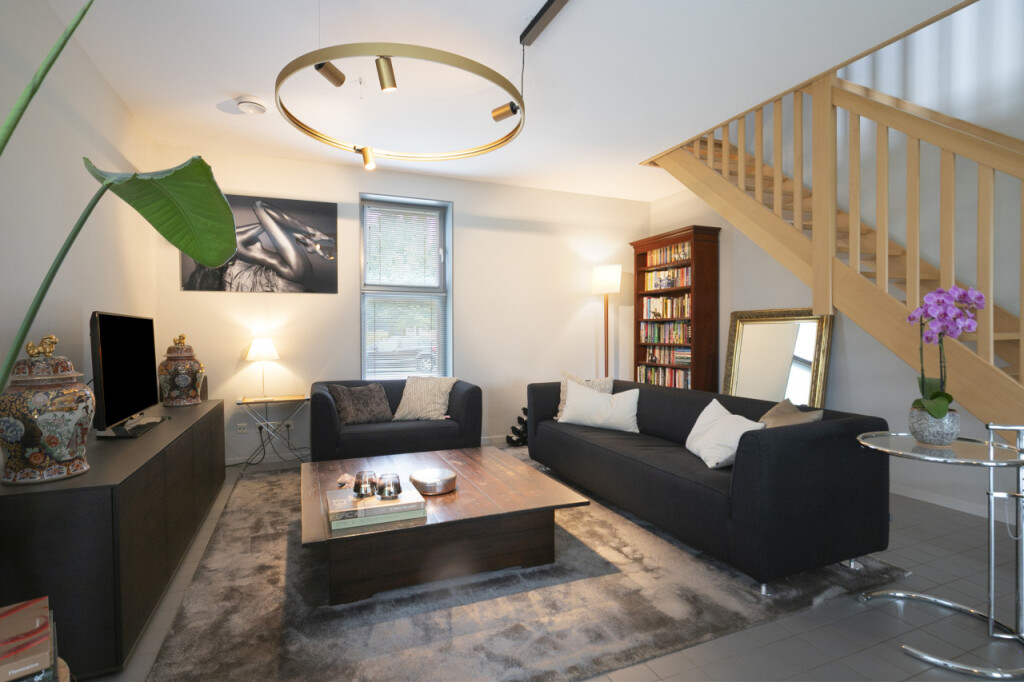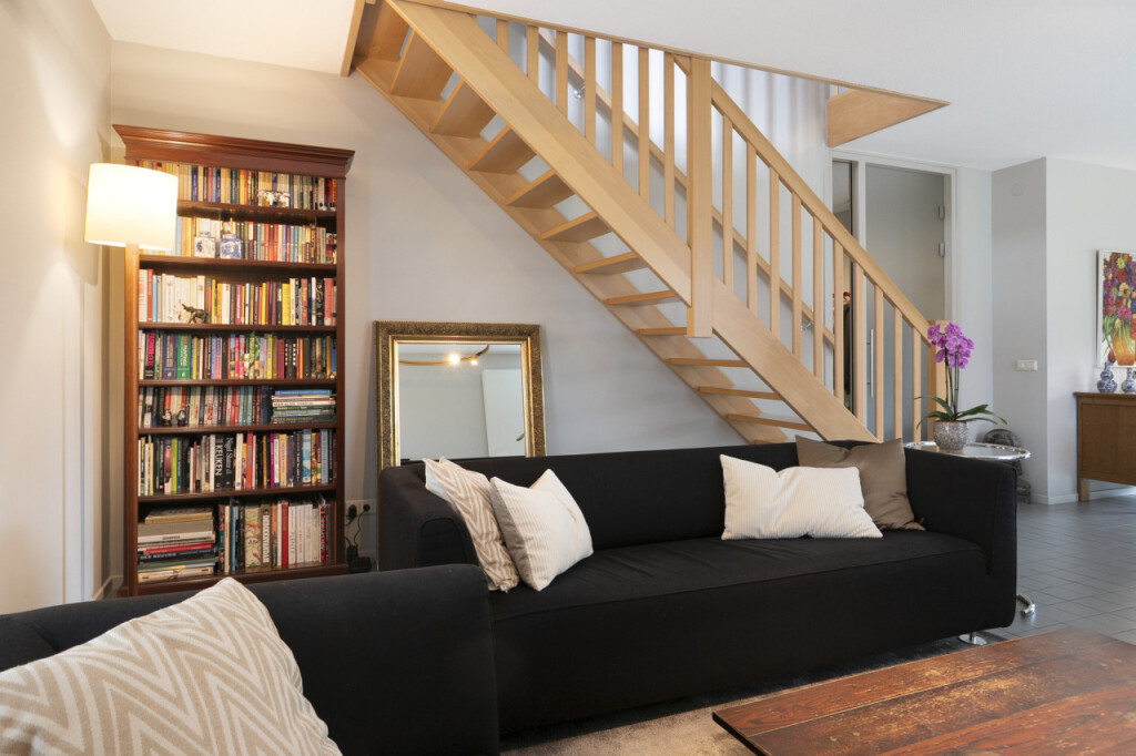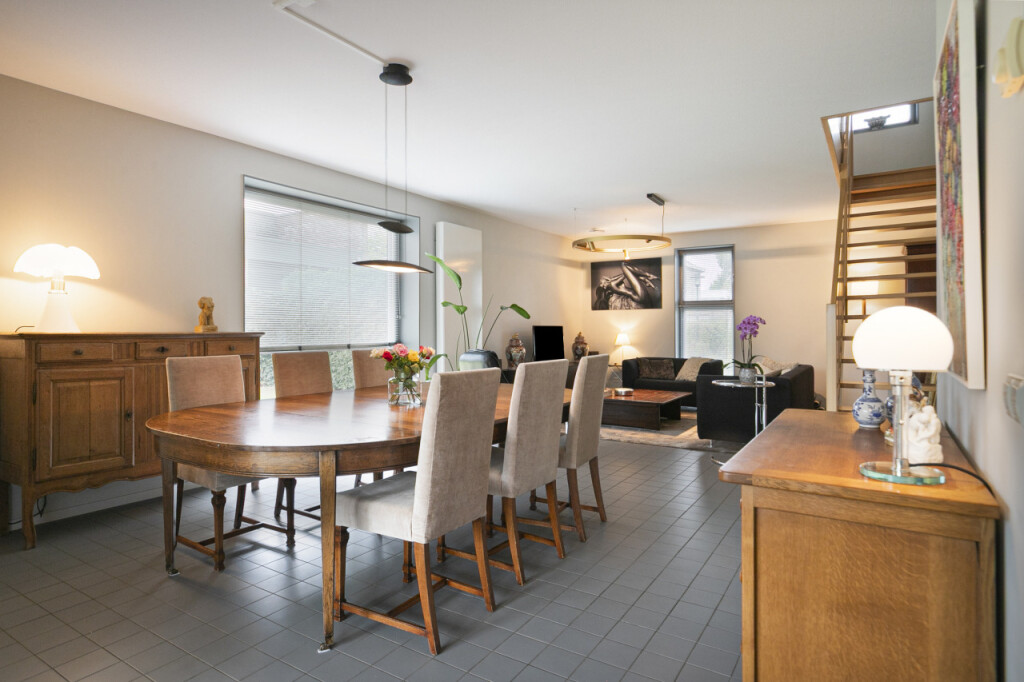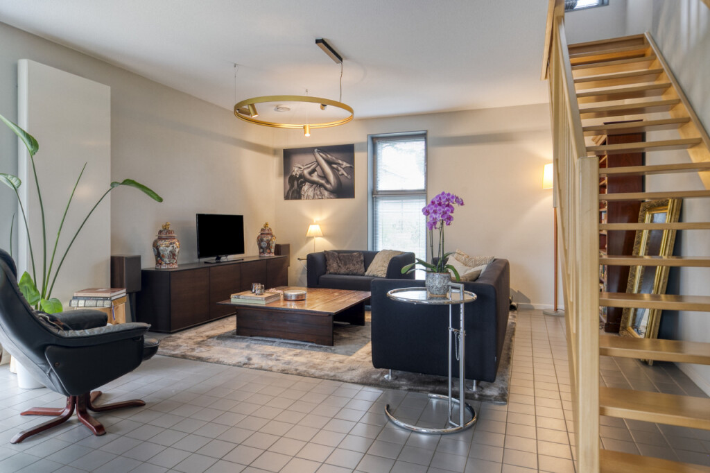 De gezellige woonkamer van bijna 60 m2 heeft een open trappartij naar de eerste verdieping. Aangrenzend vind je de moderne stijlvolle Siematic keuken, luxe afgewerkt en compleet met diverse inbouwapparatuur zoals een kookplaat, oven, afzuigkap, koelkast en vaatwasser.