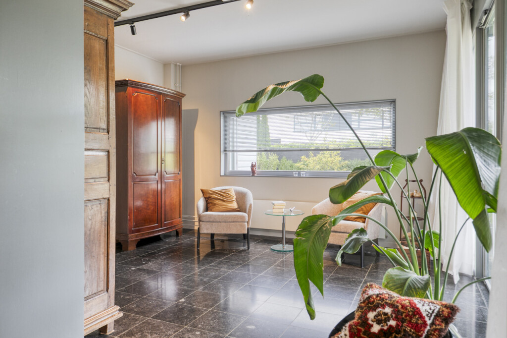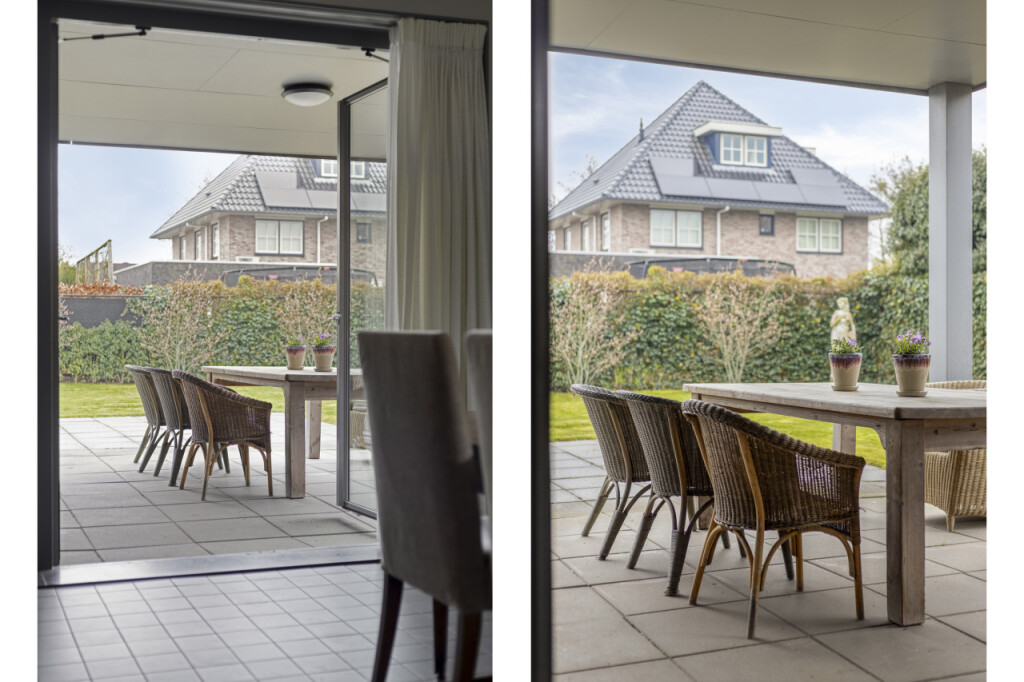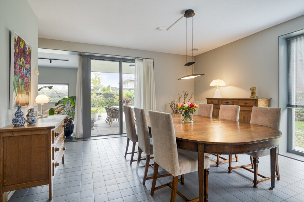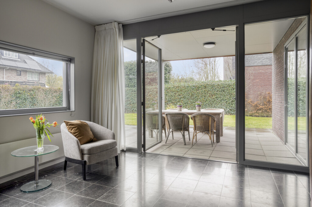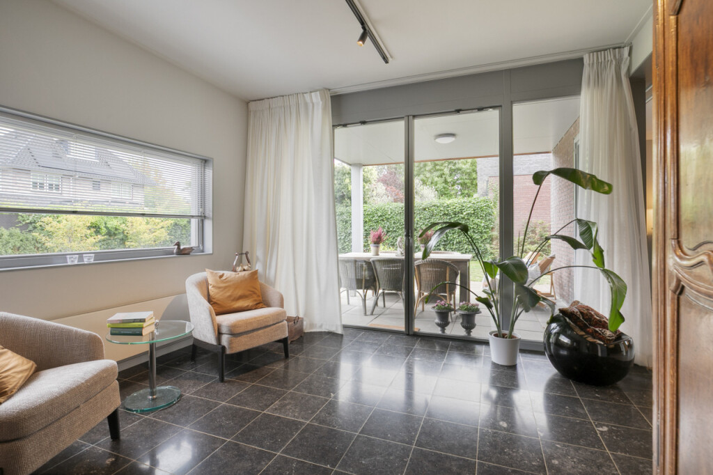 De woonkamer omvat ook een mooie tuinkamer met toegang tot het overdekte terras. Deze ruimte kun je flexibel gebruiken, bijvoorbeeld als extra zithoek, speel- of werkkamer.