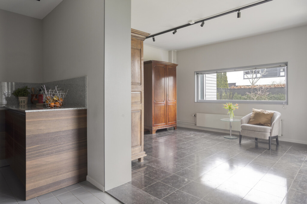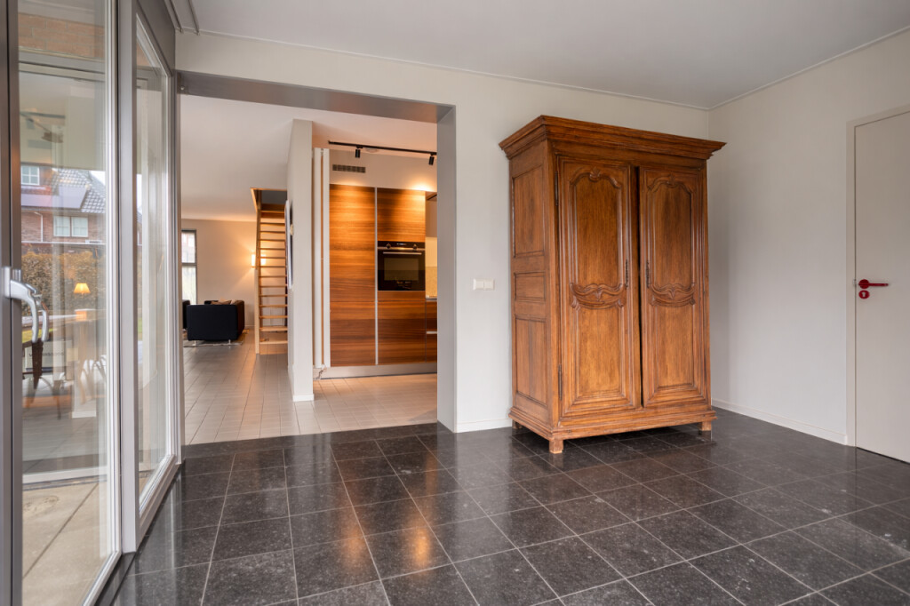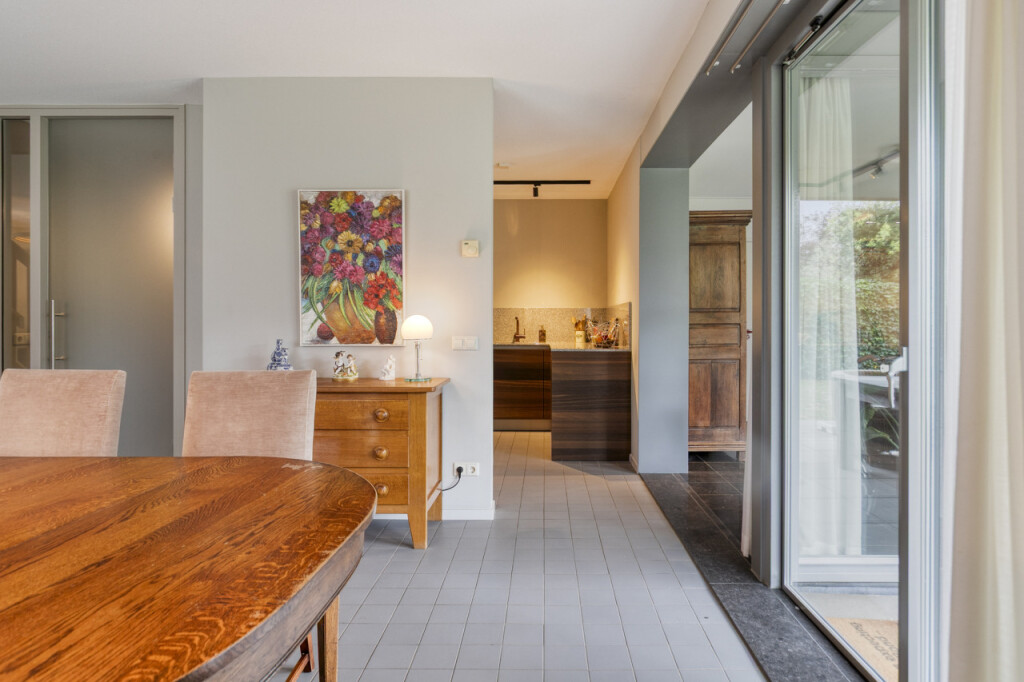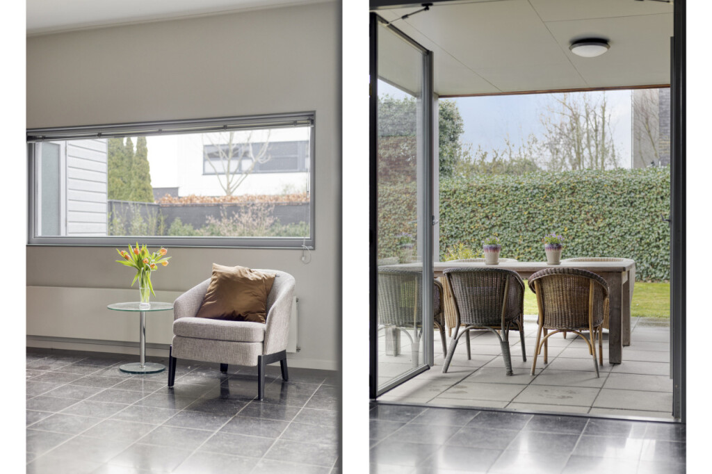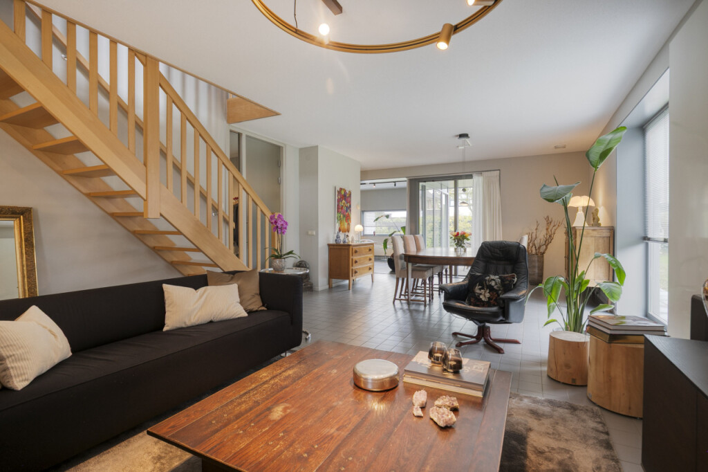 De woonkamer omvat ook een mooie tuinkamer met toegang tot het overdekte terras. Deze ruimte kun je flexibel gebruiken, bijvoorbeeld als extra zithoek, speel- of werkkamer.