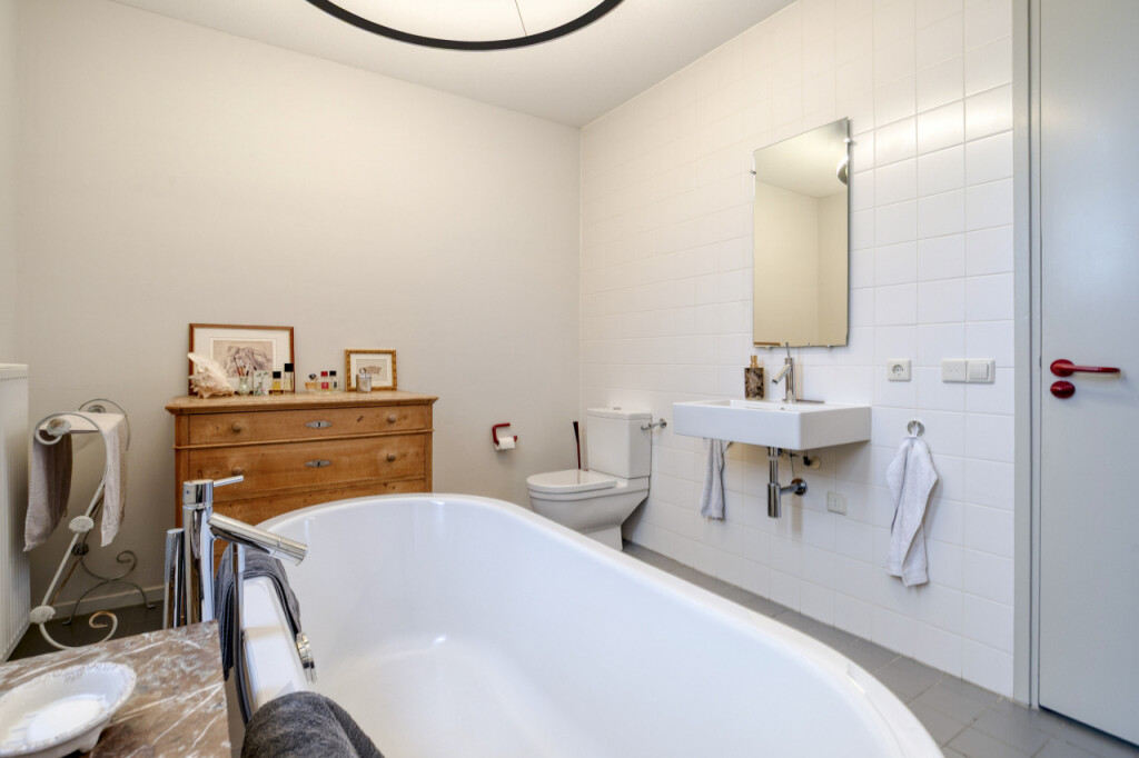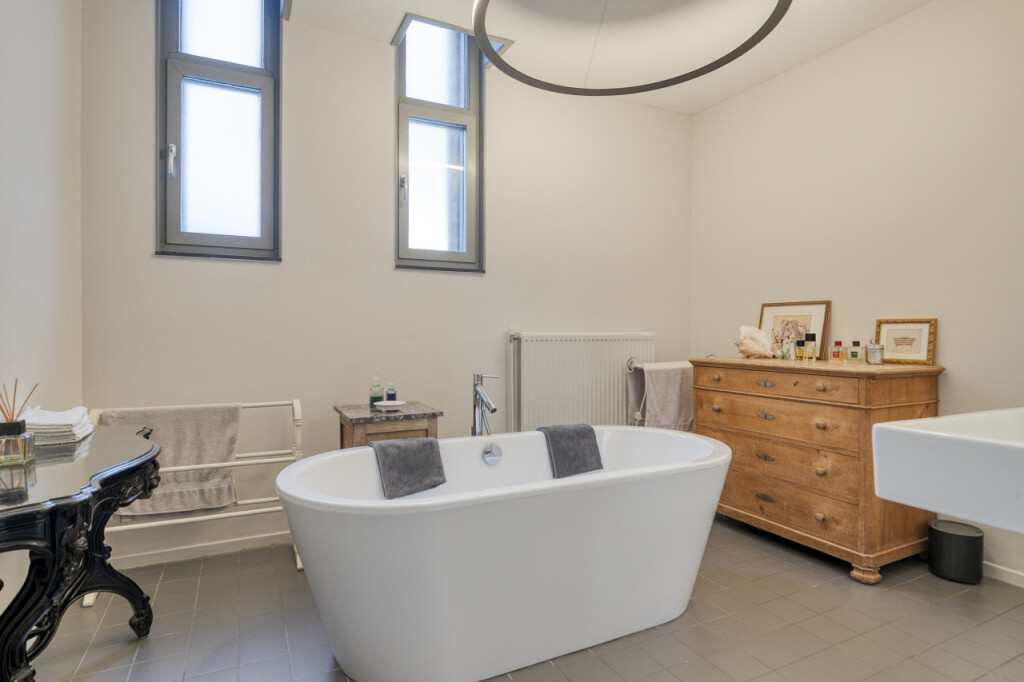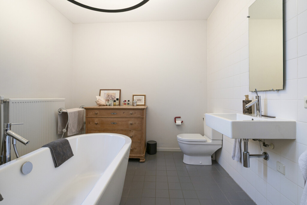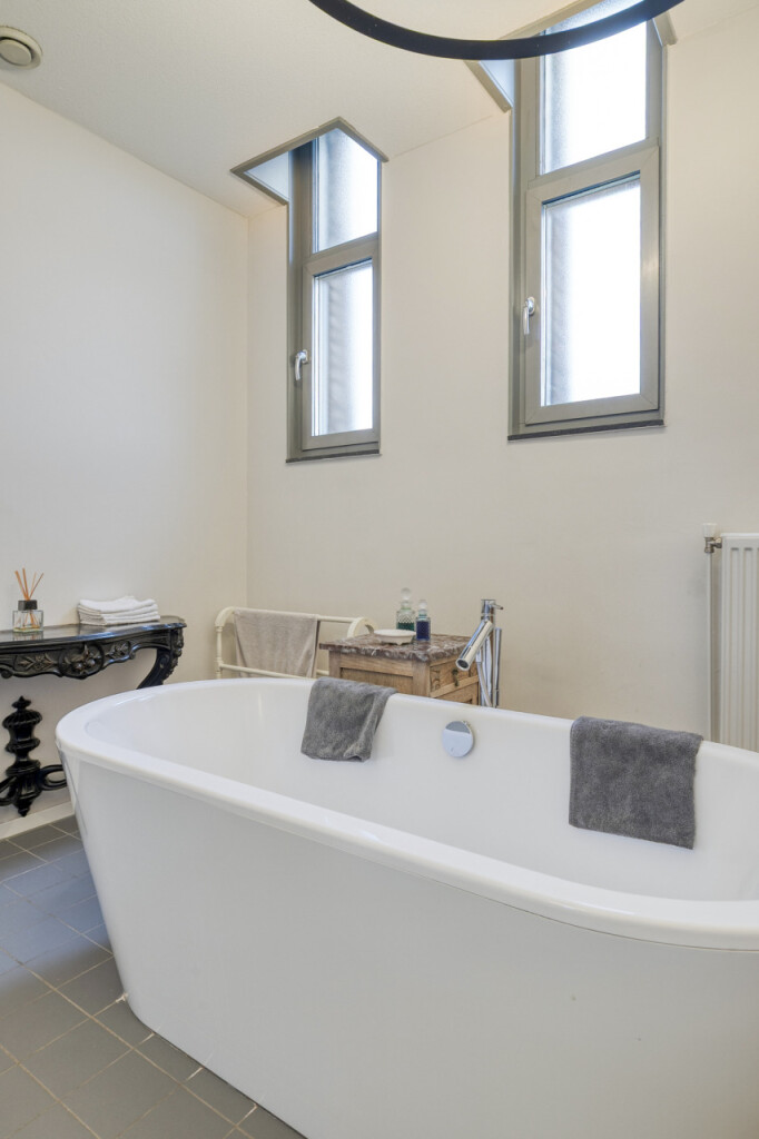 De royale badkamer is modern ingericht en voorzien van een vrijstaand Philippe Starck bad, toilet en wastafelmeubel met spiegel. Daarnaast is er op deze verdieping nog een praktische berging aanwezig waar de cv-ketel, WTW balansventilatie en CO melder staan opgesteld.