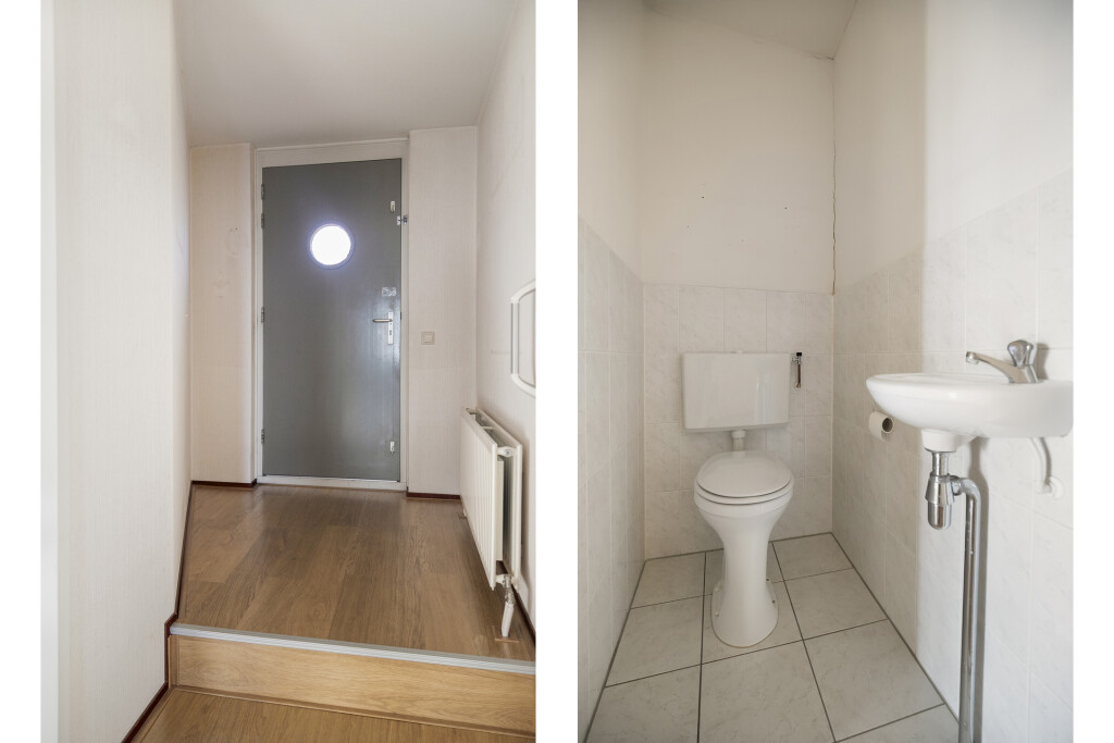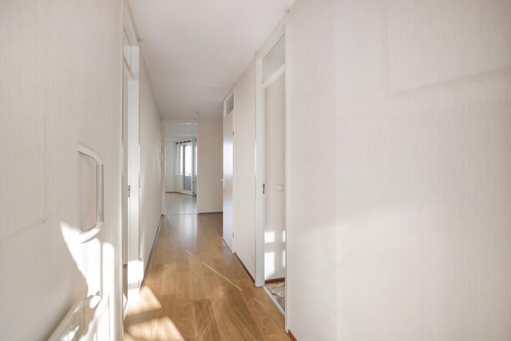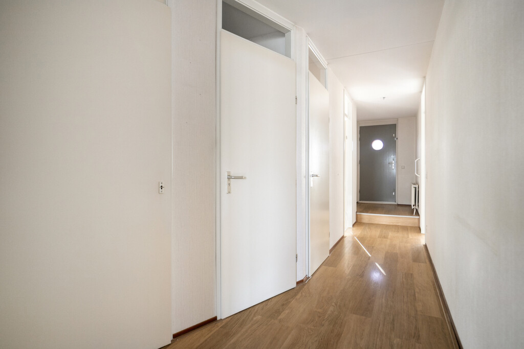 Binnenkomst in de hal met videofoon en nette vloer in laminaat. Vanuit de hal zijn de woonkamer, slaapkamers, toilet, badkamer en berging bereikbaar.