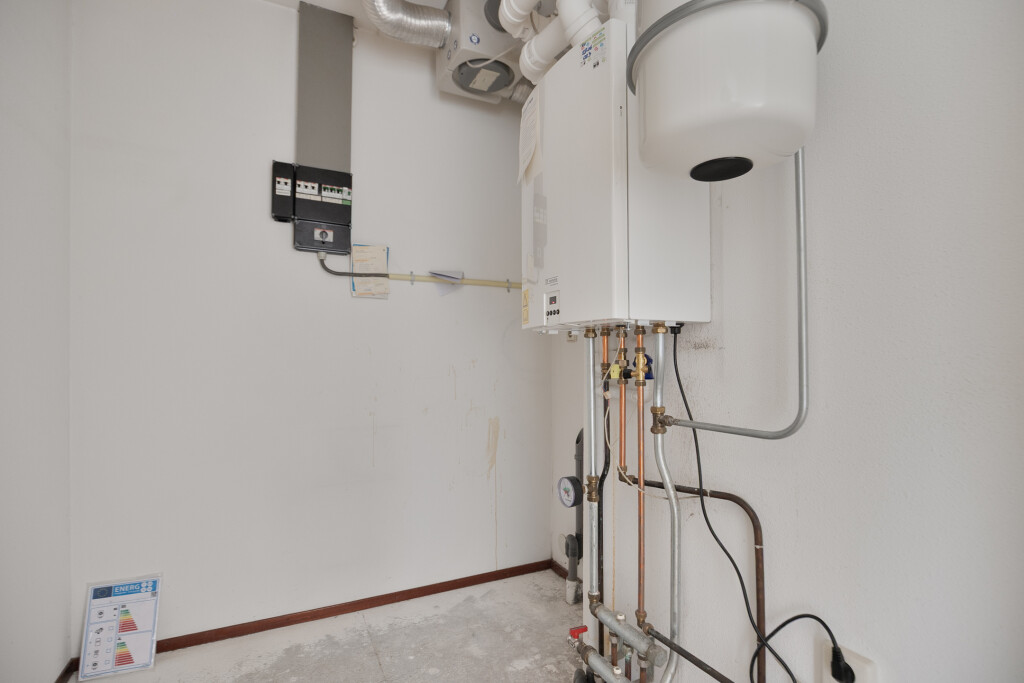 In de berging bevindt zich de witgoed aansluitingen en de Cv-combiketel (Intergas HR).