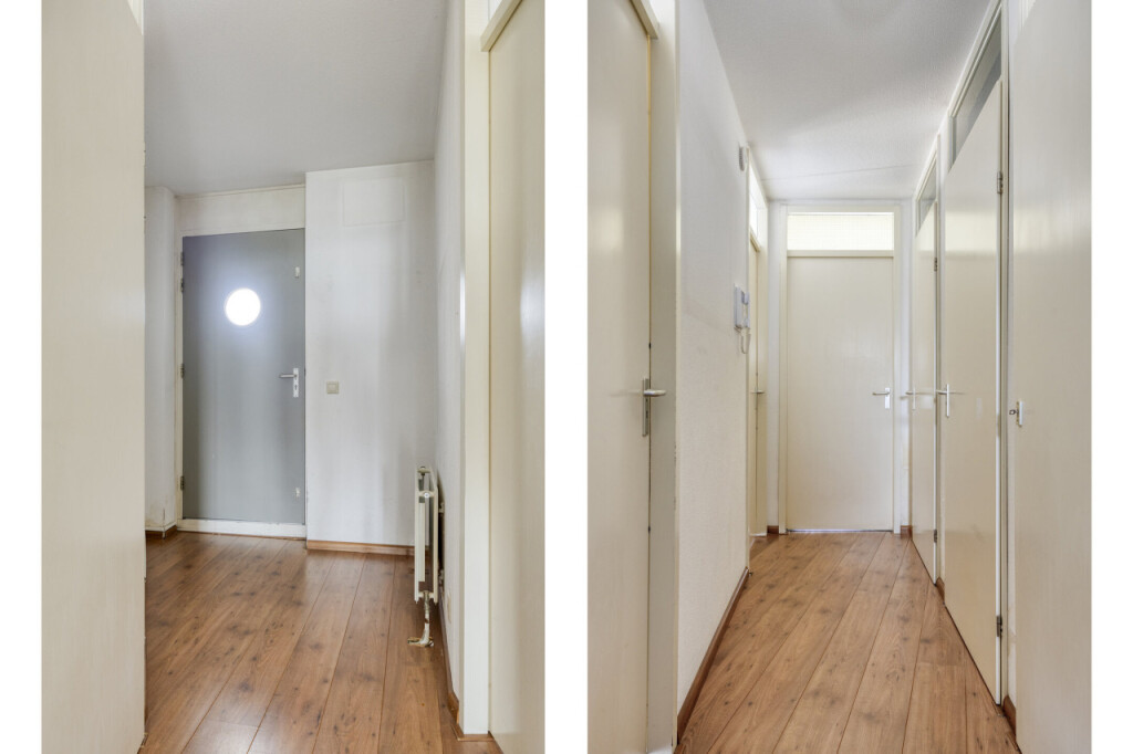 Binnenkomst in de hal met videofoon en nette laminaat vloer. Vanuit de hal zijn de woonkamer, slaapkamers, toilet, badkamer en berging bereikbaar.