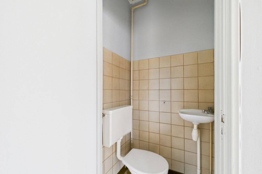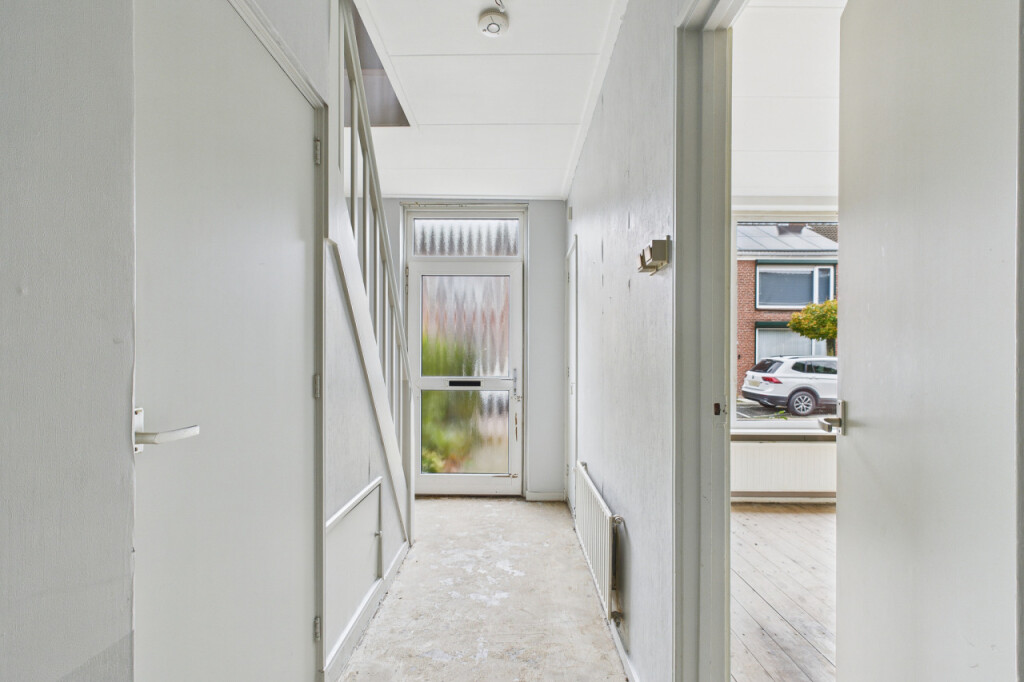 Hal met meterkast, trapopgang, trapkast en een eenvoudig toilet. Lichte doorzon woonkamer met vaste kastruimte en toegang tot de dichte keuken. De keuken is zowel vanuit de woonkamer als vanuit de hal bereikbaar en beschikt over vaste kasten, een eenvoudig keukenblok en een achterdeur naar de tuin.