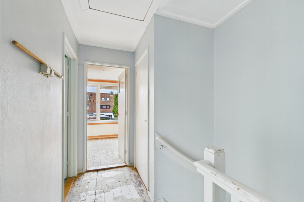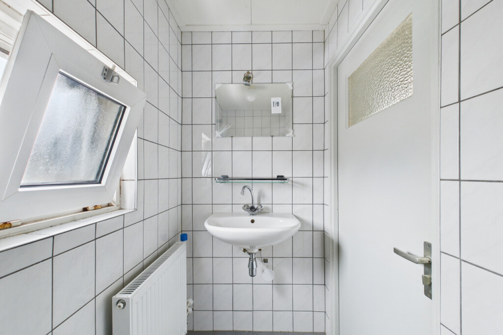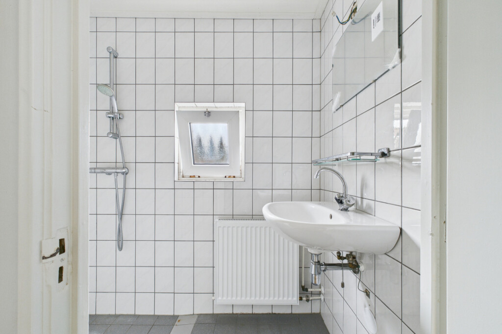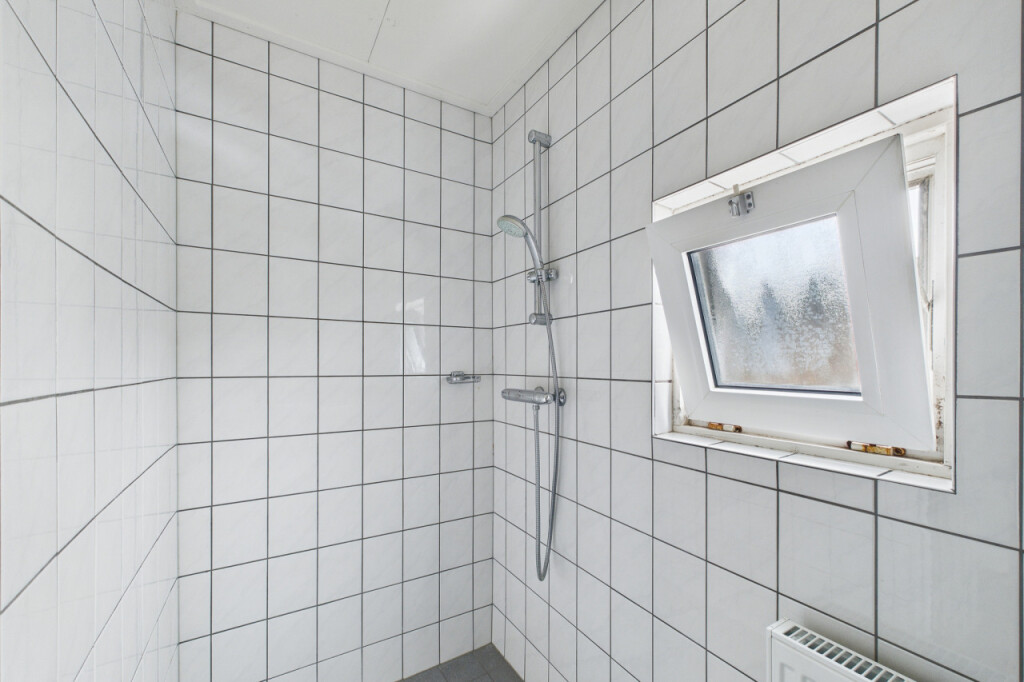 Overloop met luik naar de zolder (bereikbaar via een schuiftrap), vaste bergkast, 3 slaapkamers met vaste kasten en een nette badkamer met wastafel en douche.