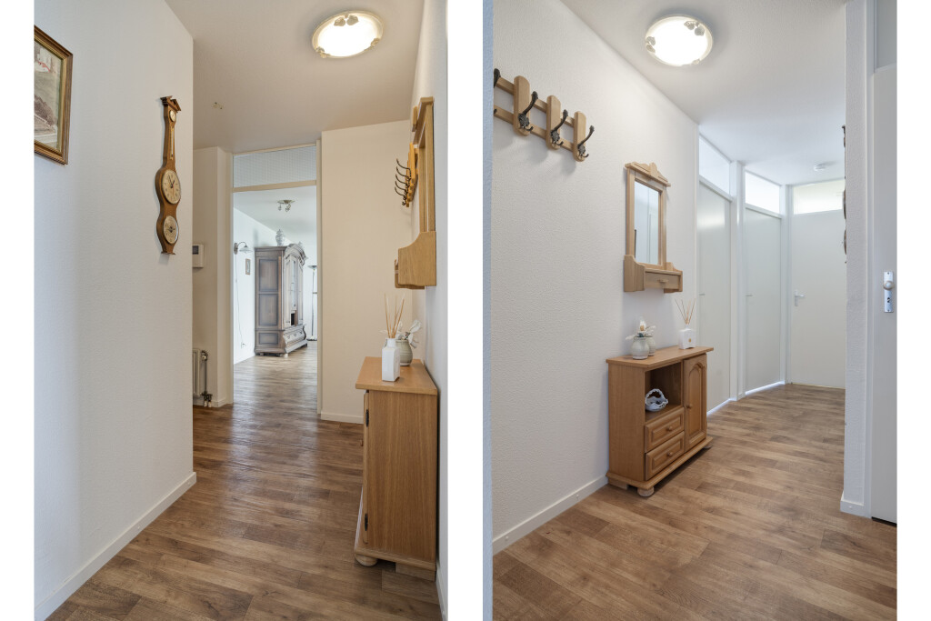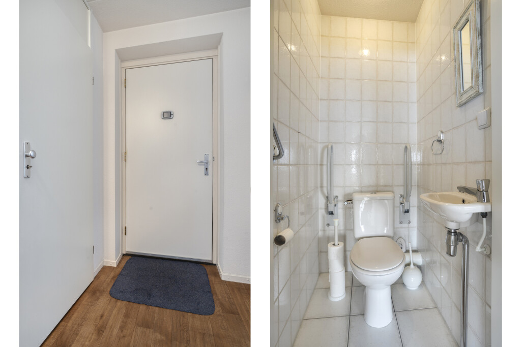 Entree via de hal welke voorzien is van een laminaatvloer. Via de hal heeft u toegang tot de toiletruimte, die geheel betegeld is en voorzien van toilet en fonteintje. Vanuit de hal heeft u toegang tot de woonkamer, badkamer en 2 slaapkamers.