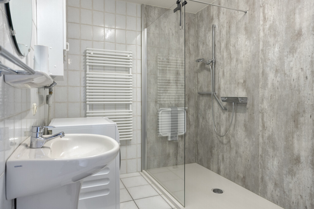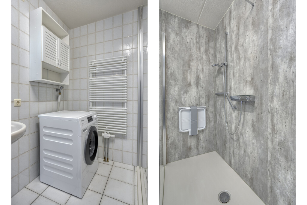 De badkamer is geheel betegeld en voorzien van een ruime inloopdouche, wastafel, designradiator en de aansluiting voor de wasapparatuur.