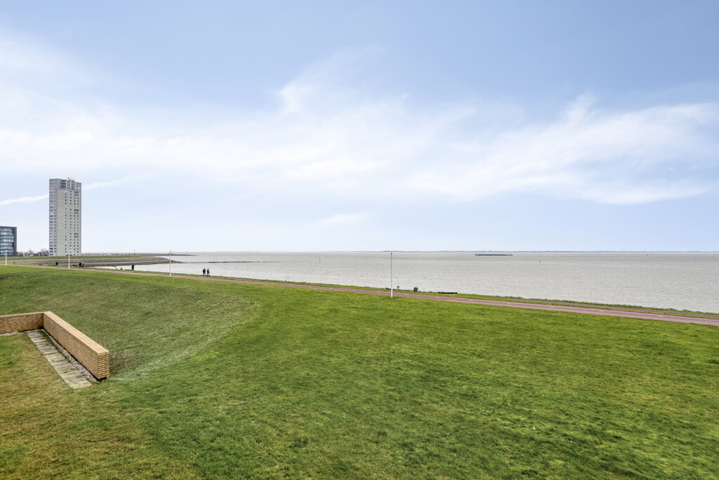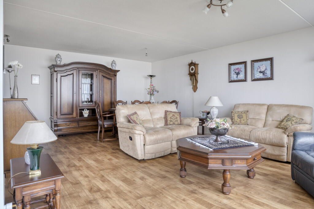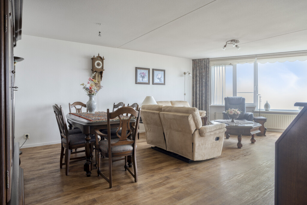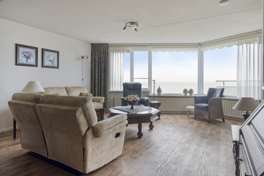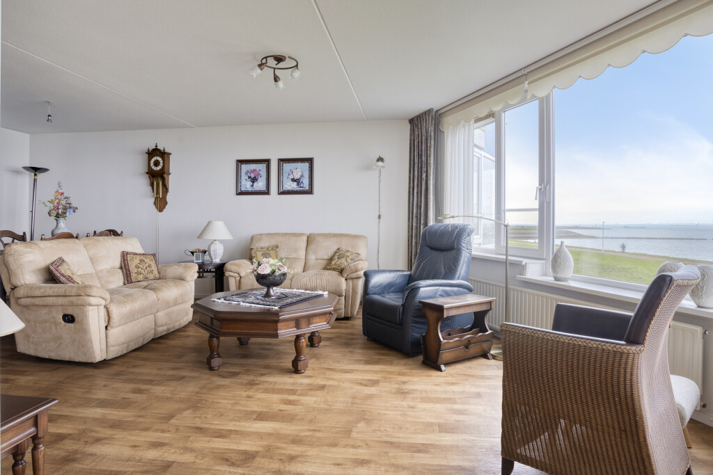 De woonkamer is voorzien van een vinylvloer. De grote raampartijen geven een mooi zicht op de Westerschelde en via de deur is het balkon bereikbaar.