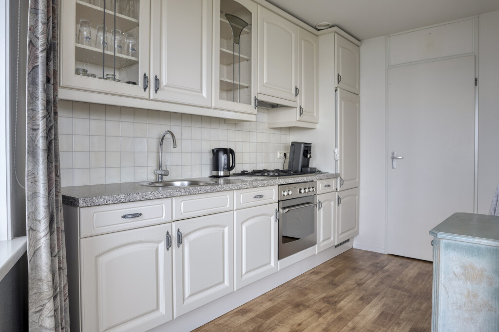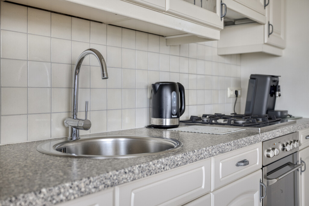 Aansluitend is de open keuken gesitueerd. De keuken is uitgevoerd in een rechte opstelling en voorzien van diverse inbouwapparatuur: