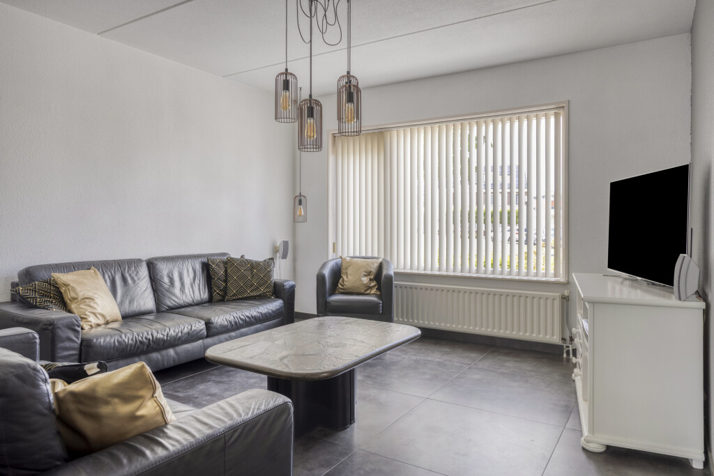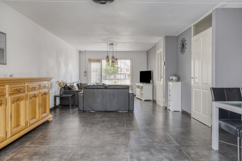 De woonkamer is voorzien van een tegelvloer en heeft een zitgedeelte aan de voorzijde en een eetgedeelte aan de achterzijde van de woning. De woning kenmerkt zich door de zonnige ligging met veel lichtinval.