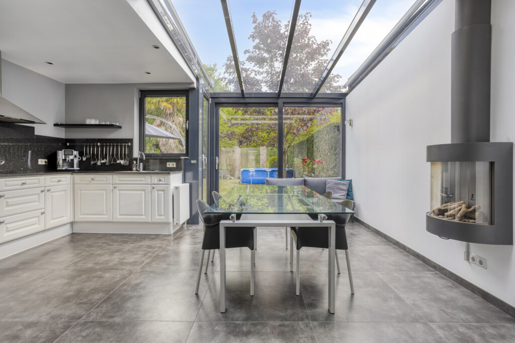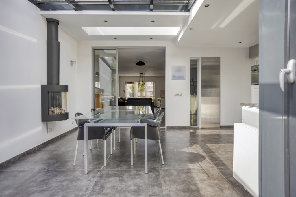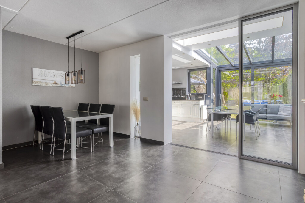 In 2013 is de woning over de gehele breedte uitgebouwd waardoor er een nieuwe keukenruimte is gecreëerd. De tegelvloer is vanuit de woonkamer doorgelegd in de keuken, waardoor het een mooi geheel vormt. Een glazen schuifdeur met aluminium profiel verbindt de woonkamer met de keuken. De lichte leefkeuken is uitgerust met een aluminium serre met schuifpui, zonwerende screens zowel aan achterzijde als dak van de keukenruimte en loopdeur, lichtstraat, inbouwspots en sfeervolle gashaard. De keuken is uitgevoerd in een hoekopstelling en beschikt over diverse inbouwapparatuur: