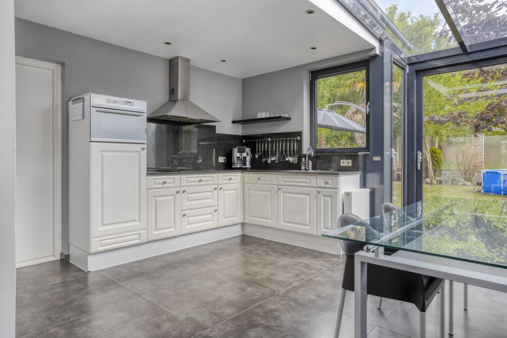 Vanuit de keuken is de achtertuin en de garage bereikbaar.