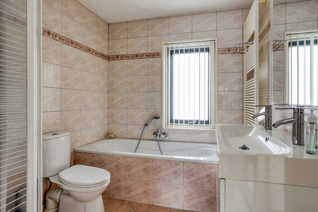 Op de eerste verdieping bevinden zich de overloop, 3 slaapkamers en de badkamer. Alle slaapkamers zijn ruim bemeten en voorzien van een laminaatvloer. De badkamer is geheel betegeld en voorzien van dubbel wastafel met meubel, toilet, douchecabine, ligbad en design radiator.