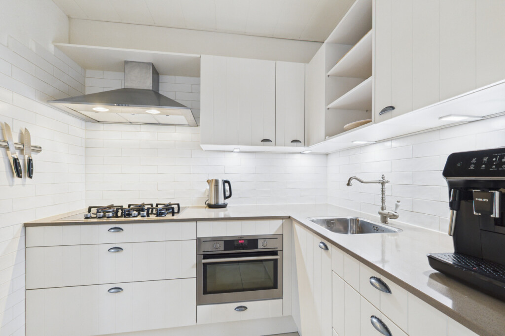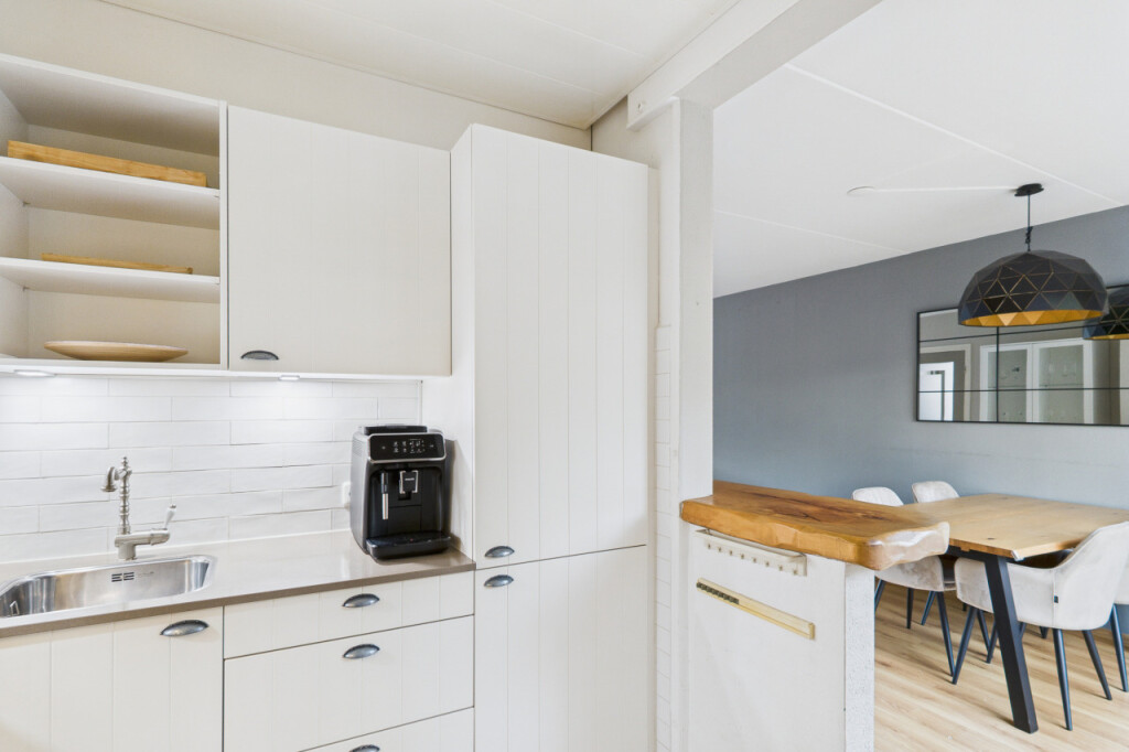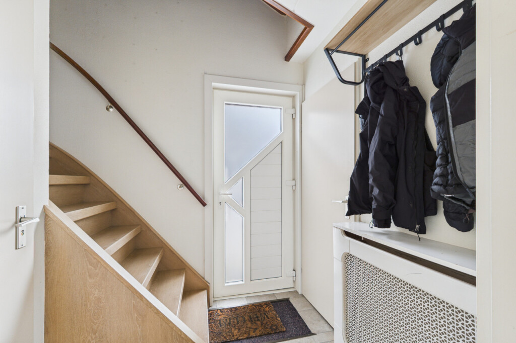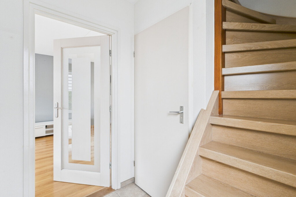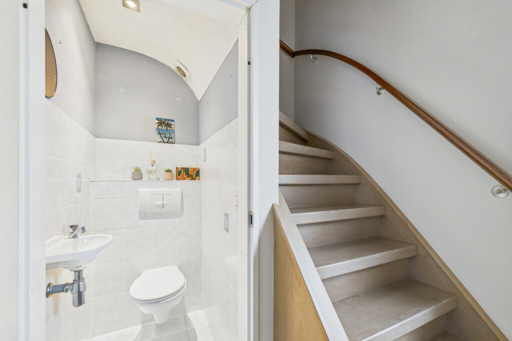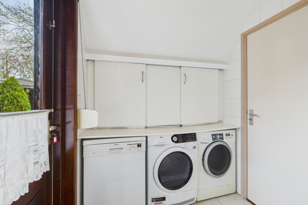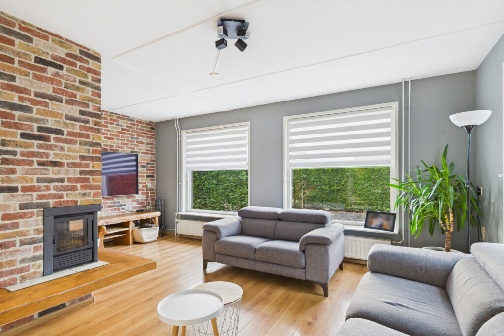Je komt de woning binnen in de hal met meterkast, toilet en trapopgang naar de eerste verdieping. Vanuit de hal stap je de ruime en gezellige L-vormige woonkamer binnen, waar de sfeervolle haard zorgt voor warmte en gezelligheid. Aan de achterzijde verbindt een schuifpui de woonkamer met de tuin, waardoor binnen en buiten mooi in elkaar overlopen. De open keuken is praktisch opgesteld in een hoek en voorzien van een gaskookplaat, afzuigkap, combi-oven, koelkast en spoelbak. Vanuit de keuken heb je toegang tot de bijkeuken met aansluitingen voor witgoedapparatuur, een loopdeur naar de tuin en een directe doorgang naar de garage, wat zorgt voor extra gemak in het dagelijks gebruik.