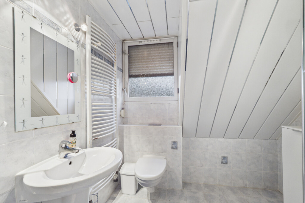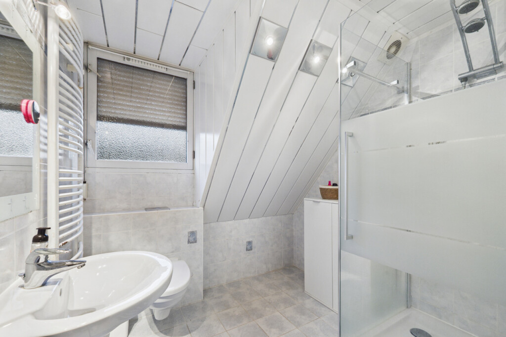 Overloop met toegang tot 3 comfortabele slaapkamers en de badkamer. De badkamer is ingericht met een douchecabine, wastafel, toilet en een design radiator.