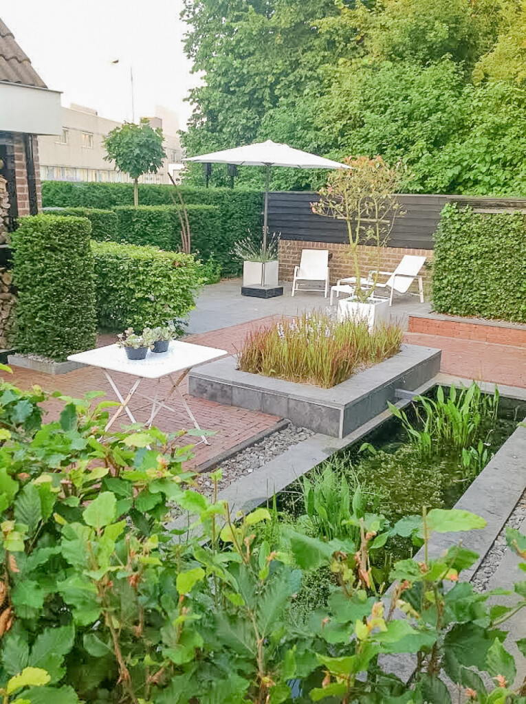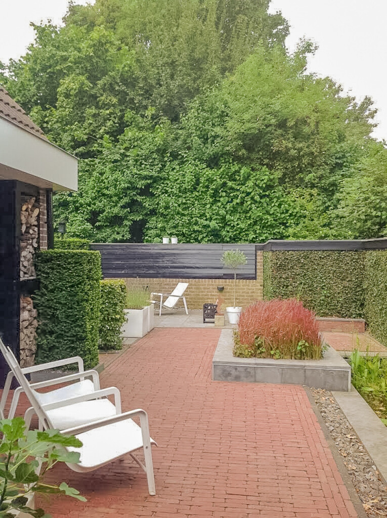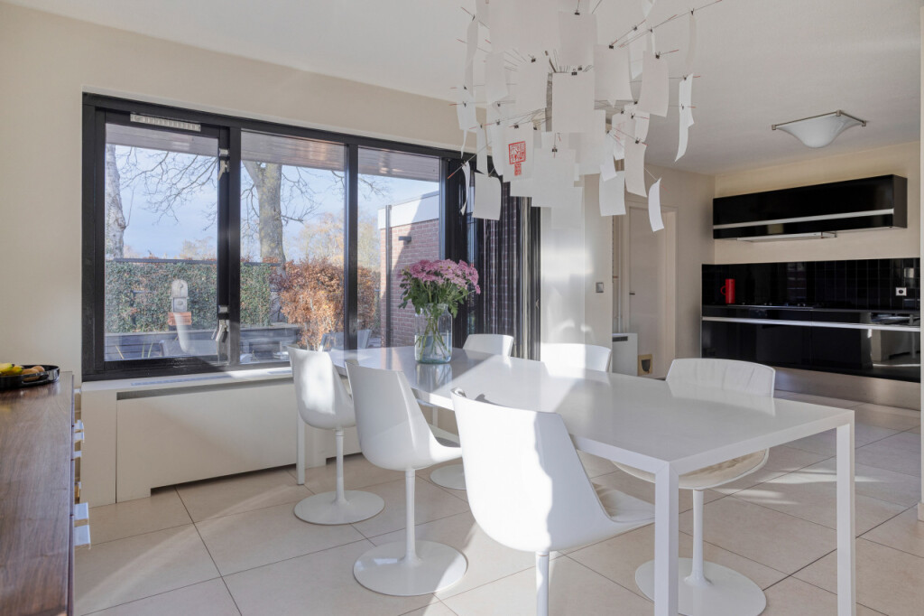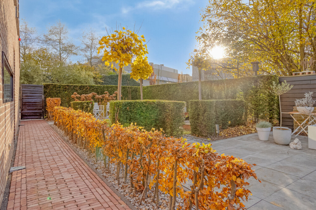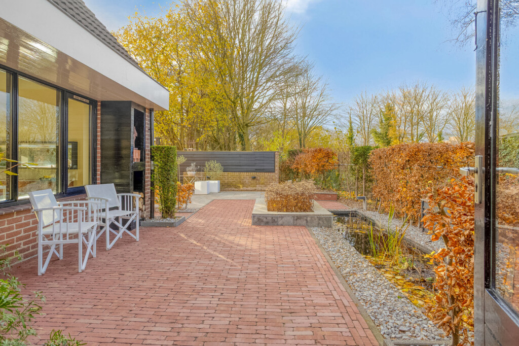 Rondom de woning ligt een prachtig verzorgde tuin. Hagen, siergrassen, vijverpartijen en verschillende terrassen vormen een groene, moderne buitenruimte waar u de hele dag door kunt genieten van zon én schaduw. De tuin biedt volledige privacy en voelt als een beschutte plek midden in de natuur.