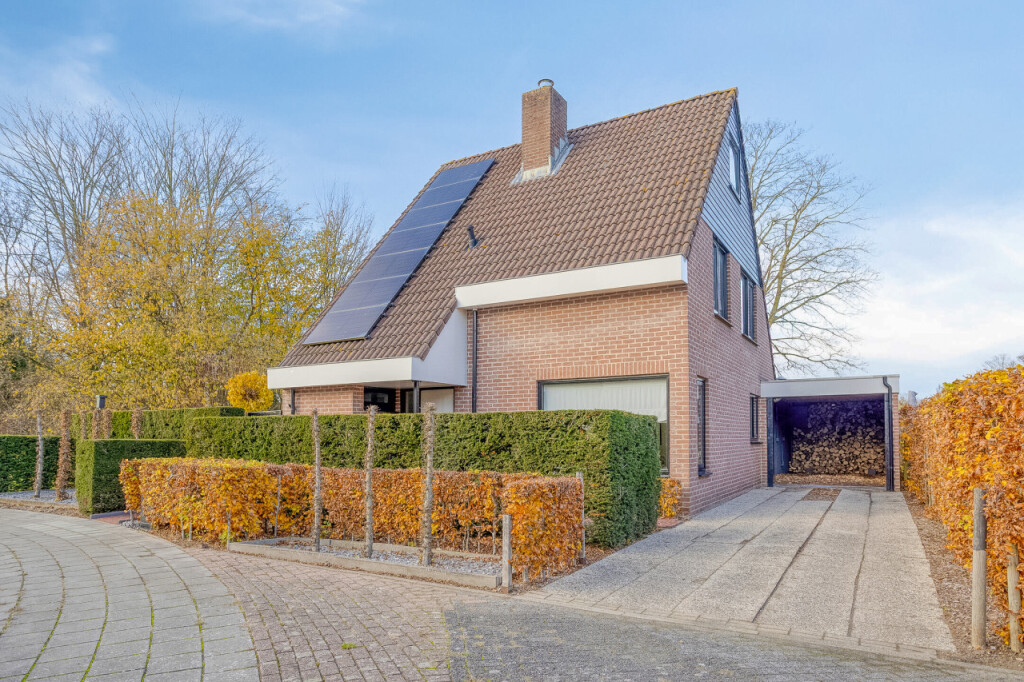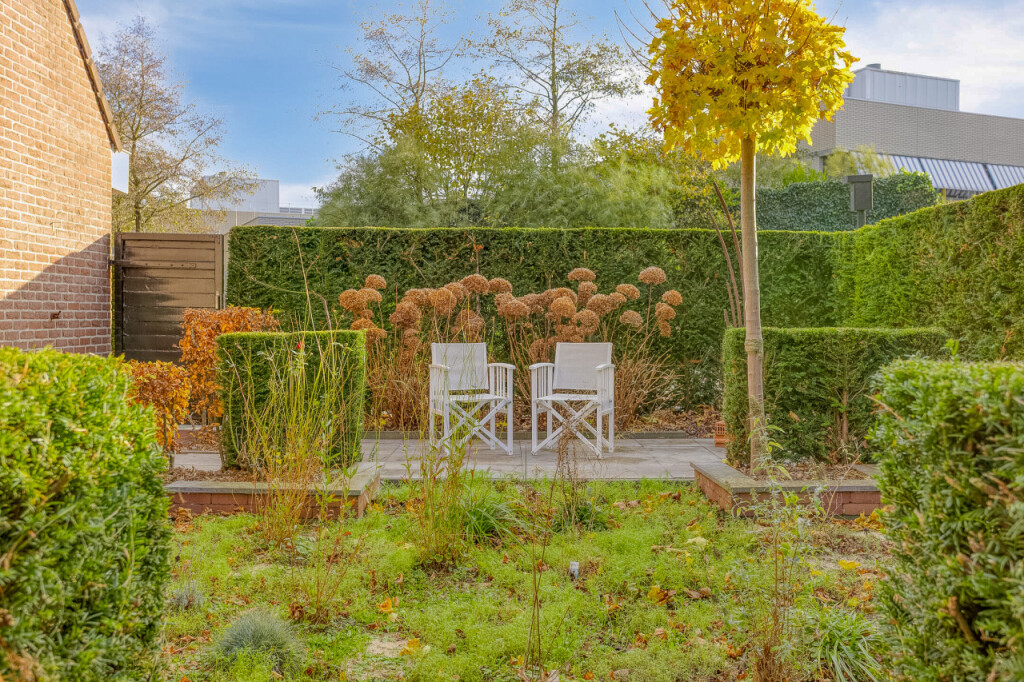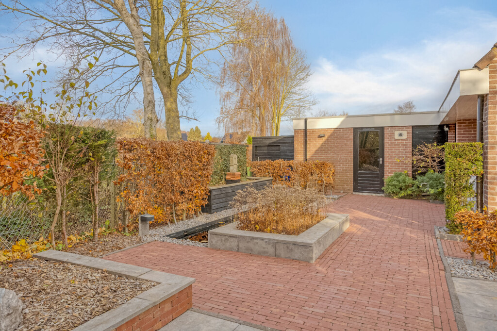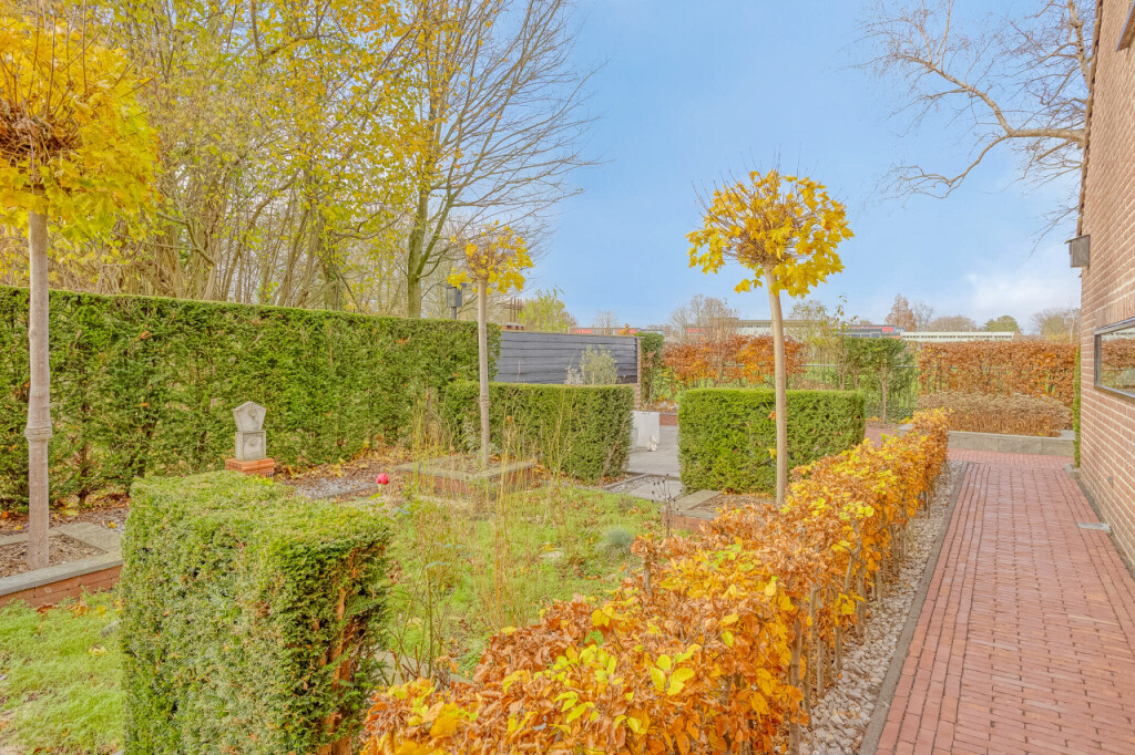De woning heeft een heerlijke tuin achter en aan de zijkant van de woning met diverse terrassen zodat er altijd wel een plekje te vinden is in de zon of in de schaduw. De tuin is omgeven door groene hagen en diverse bomen wat er voor zorgt dat je heerlijk beschut zit met veel privacy met het gevoel dat je midden in de natuur bent. Aan de voorzijde van de woning is er een handige berging/carport.