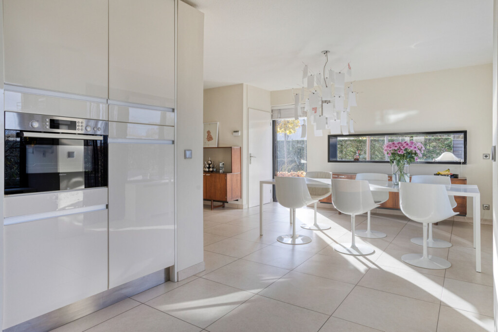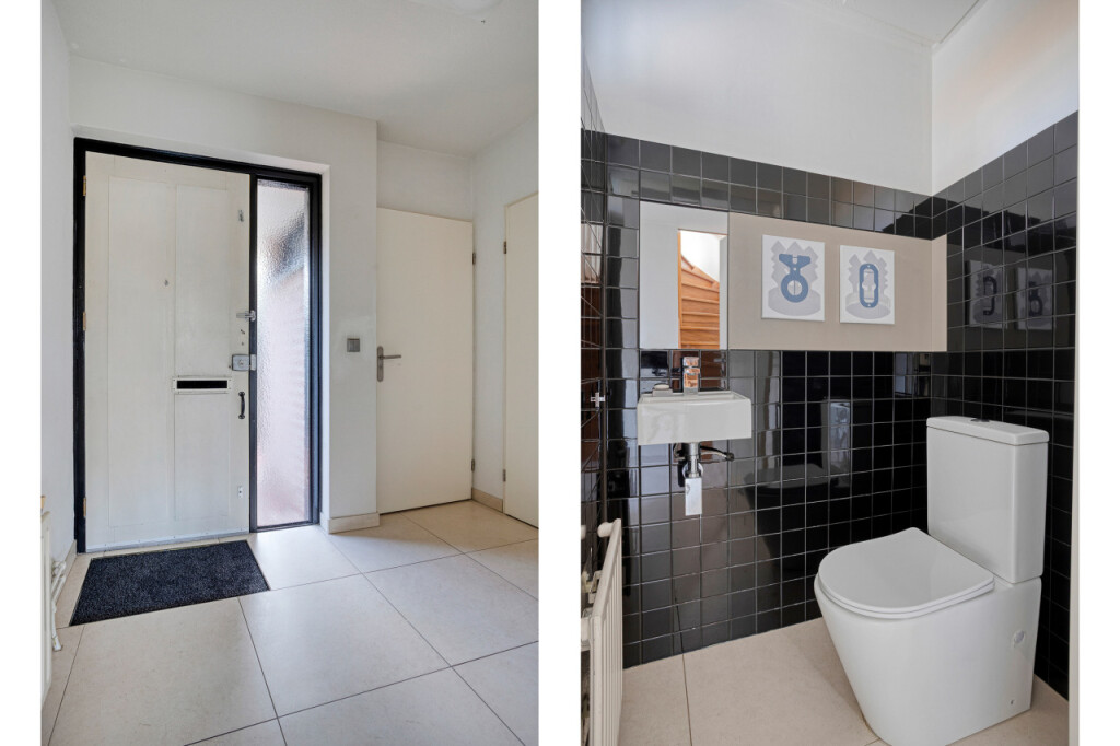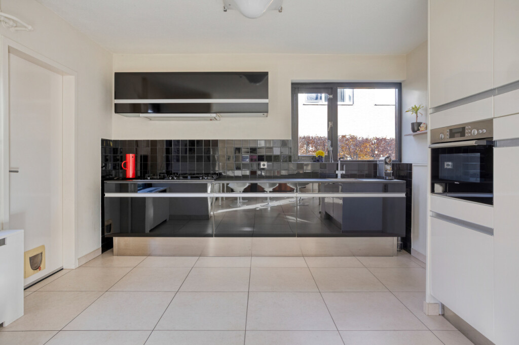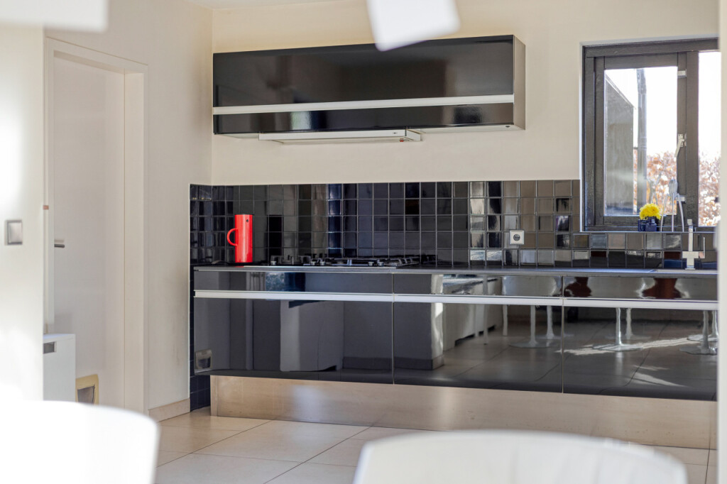 De keuken is een statement op zichzelf: strak, glanzend, modern en Italiaans design. De donkere tegelwand combineert prachtig met de lichte vloer en het minimalistische lijnenspel. Hier kun je uitgebreid koken, experimenteren of gewoon gezellig aanschuiven; de ruimte voelt groot, luxe en uitnodigend. De ruimte is groot genoeg om comfortabel te koken, gezellig te ontbijten en tegelijk in contact te blijven met de rest van het gezin.