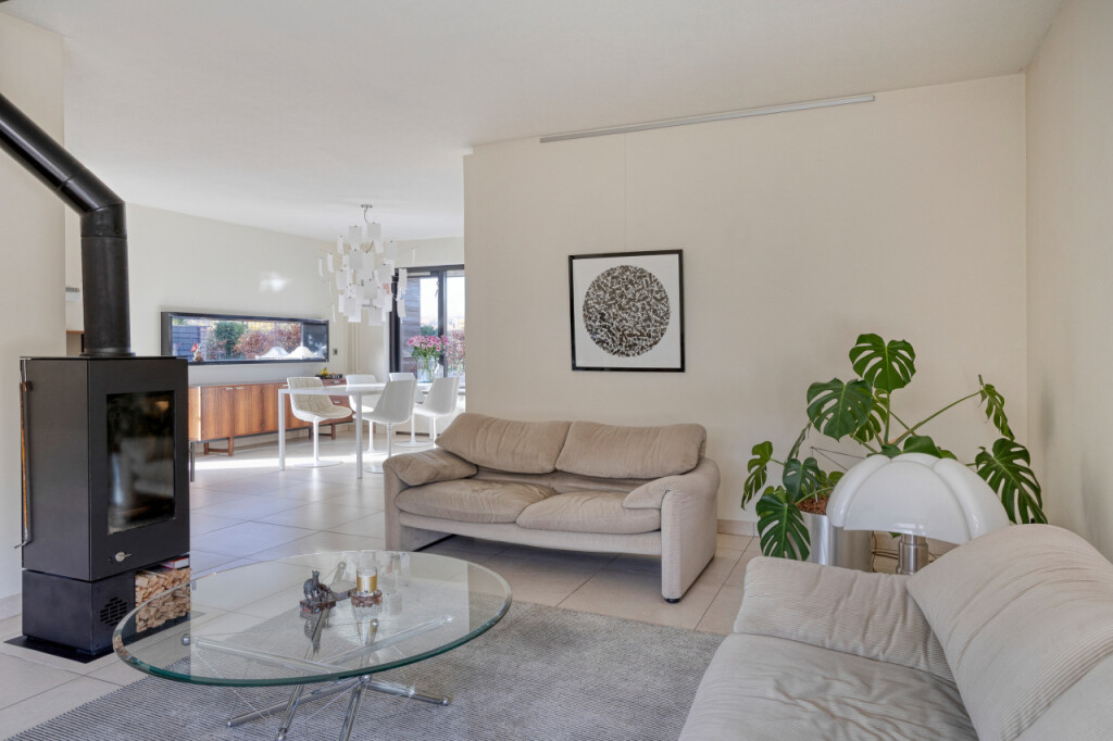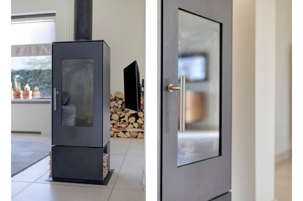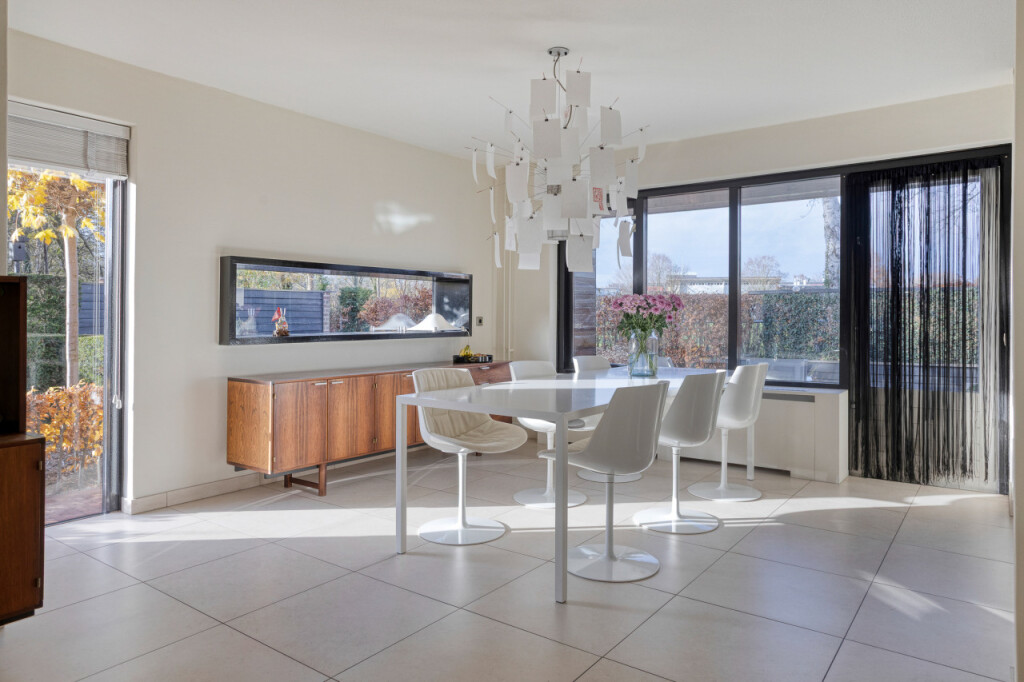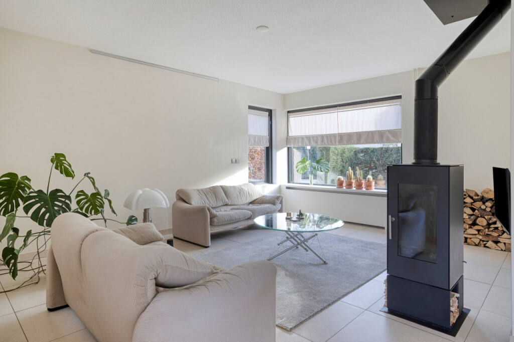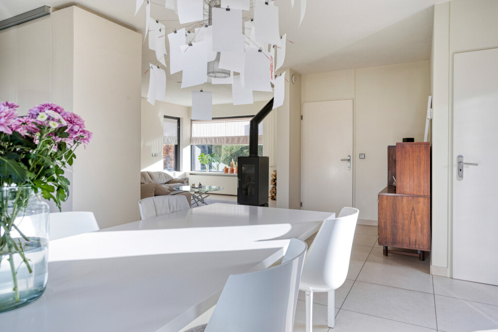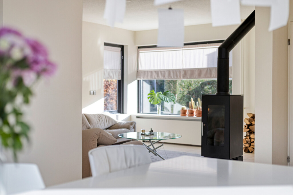 De woonkamer is een plek waar je vanzelf langer blijft zitten. Grote ramen laten de hele dag door licht binnen, waardoor de ruimte een bijna serene rust uitstraalt. Midden in de kamer staat een echte blikvanger: een 360° draaibare hoogrendementskachel. Warmte én sfeer, precies waar je ’m wilt hebben; of je nu leest, borrelt of samen op de bank ploft. De zithoek loopt moeiteloos over in de eetruimte, waar je uitkijkt op de tuin.