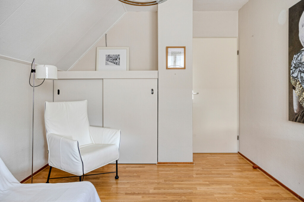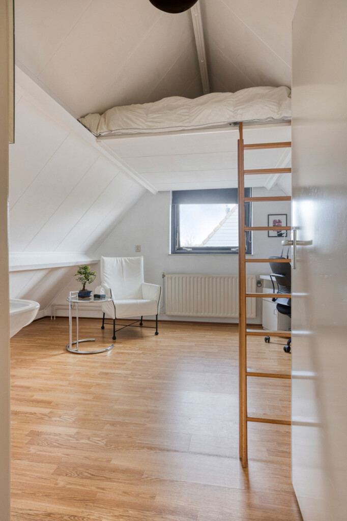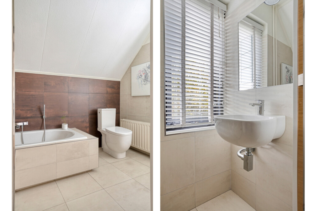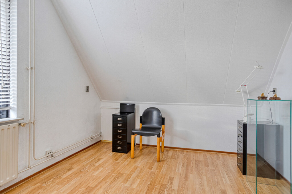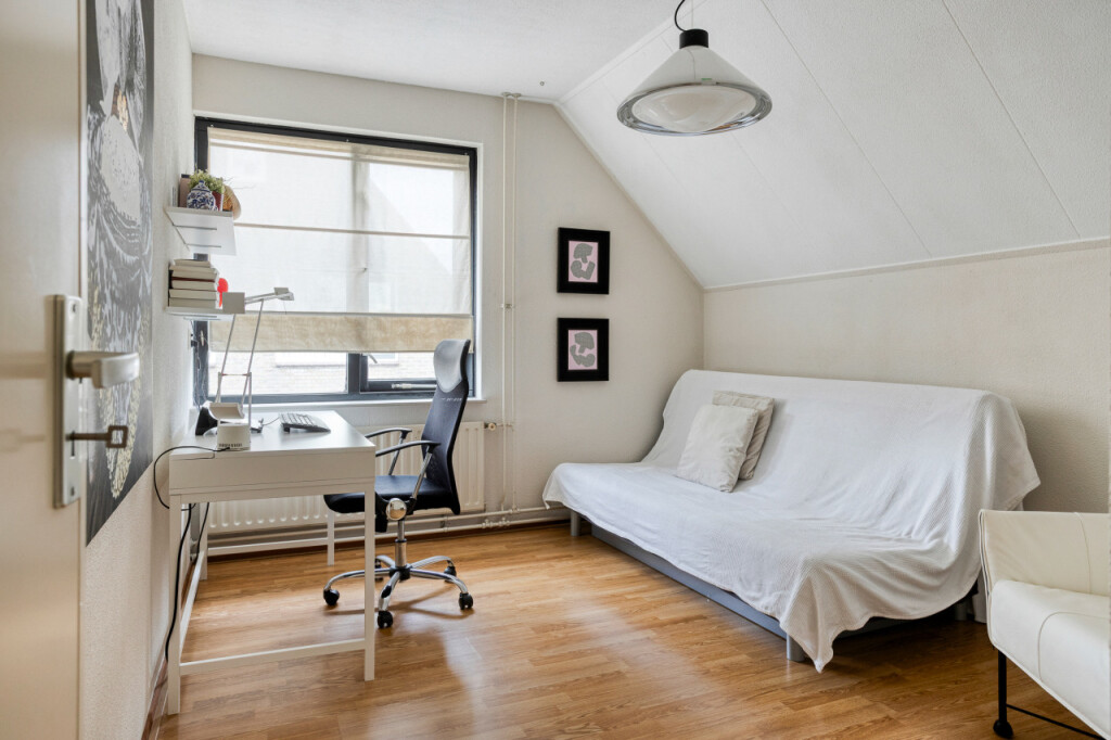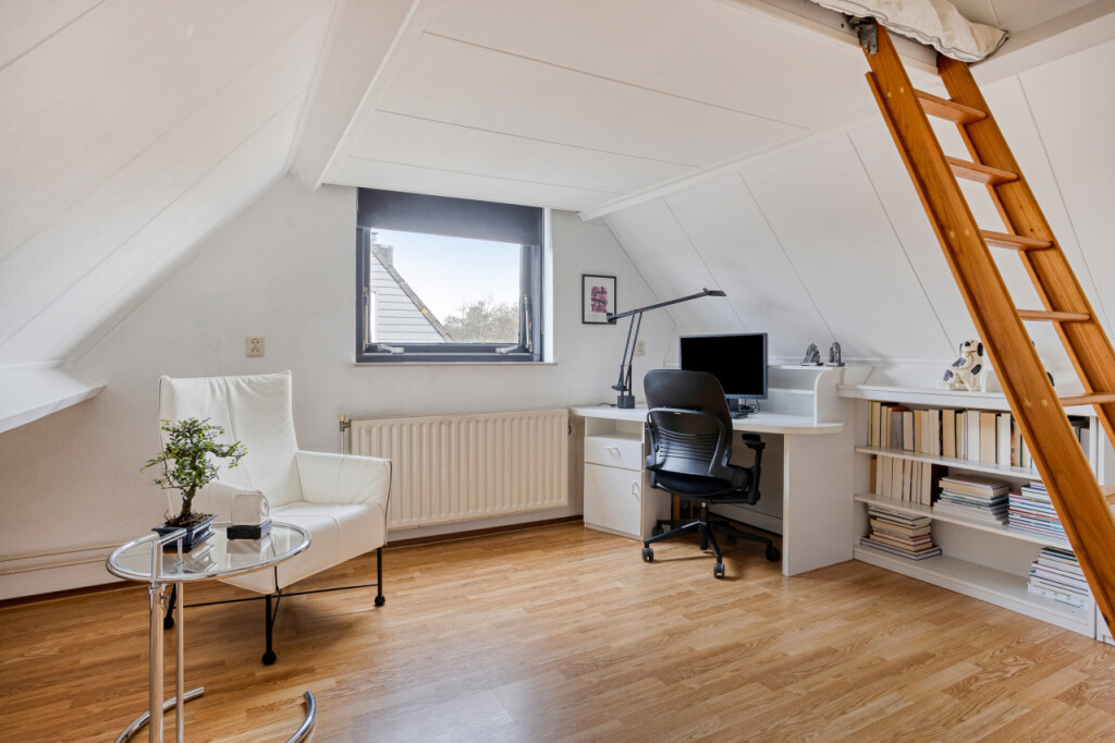 De eerste verdieping beschikt over drie volwaardige slaapkamers, elk licht en prettig van formaat. De badkamer is modern ingericht, met een combinatie van lichte en warme tegels, een ligbad én een aparte douche, wasmeubel en toilet. Een fijne, keurige ruimte die direct gebruikt kan worden zonder aanpassingen. De tweede verdieping vormt een verrassend ruime extra leeflaag. Hier bevindt zich een vierde slaapkamer met een hoge nok, een frisse afwerking en een handige extra slaapplek op de vliering. De schuine zijden zijn optimaal benut voor bergruimte, waardoor de kamer zowel praktisch als sfeervol is.