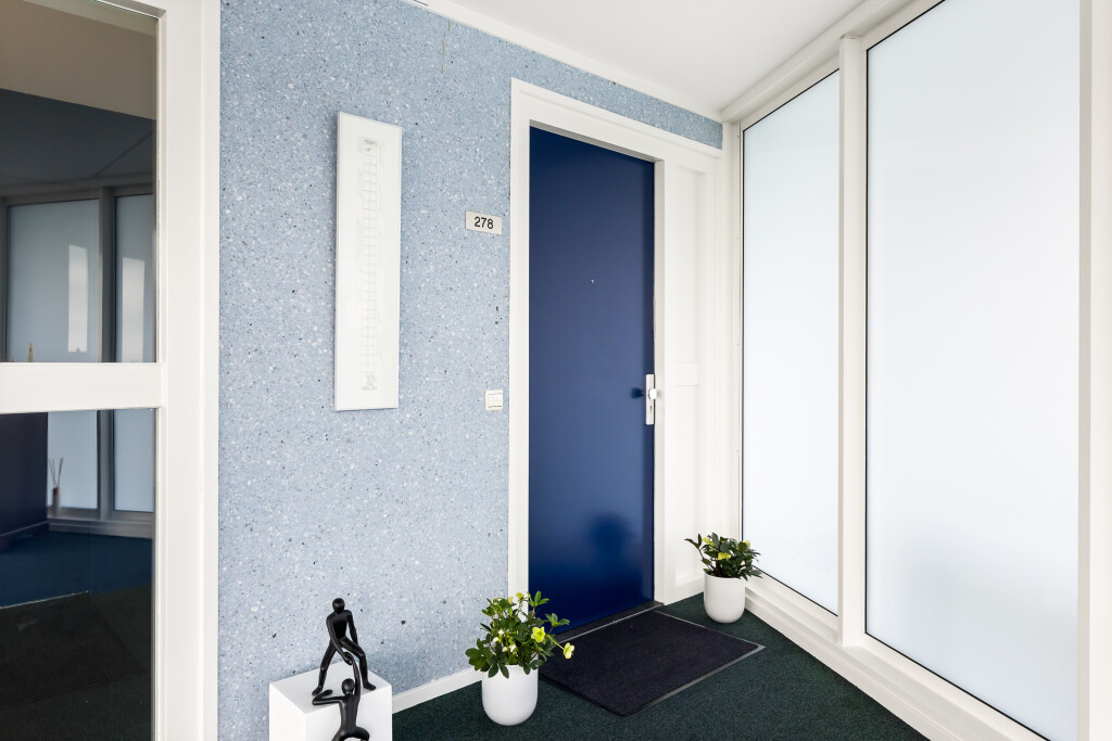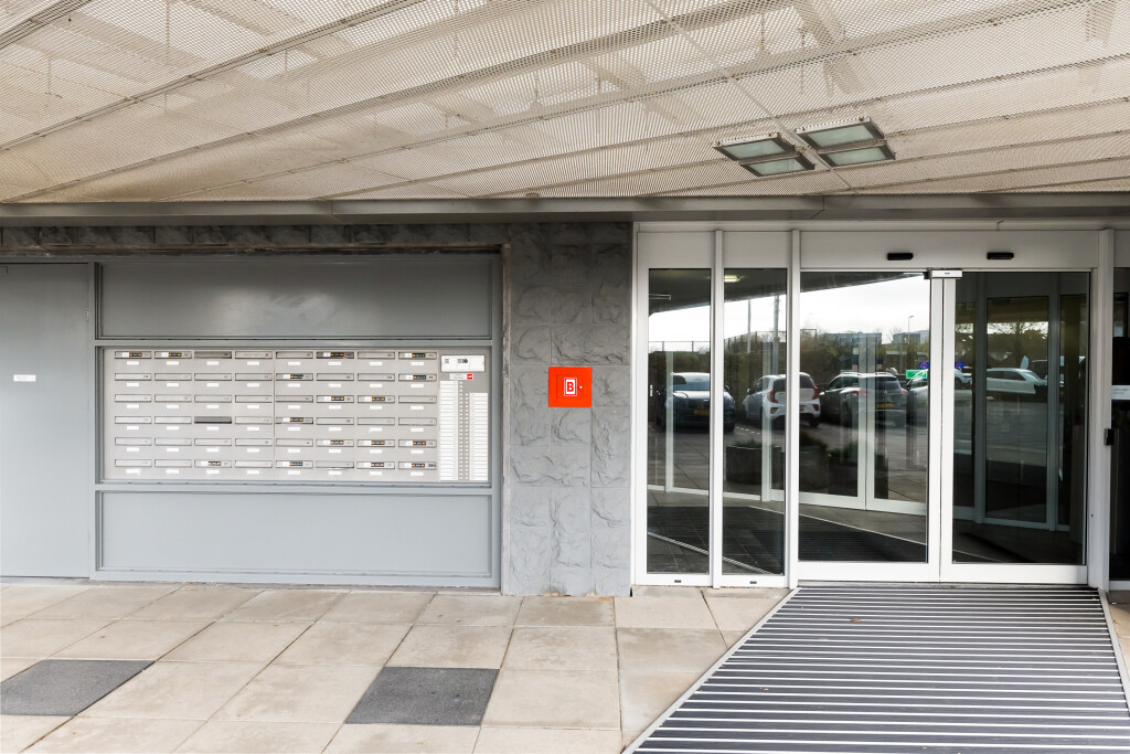 Centrale entree met dubbele schuifdeuren met tochtsluis. Postboxen met videofoon en toegang naar twee liften. Via de centrale hal met een gemeenschappelijke galerij, trappenhuis en lifthal bereikt u het penthouse.