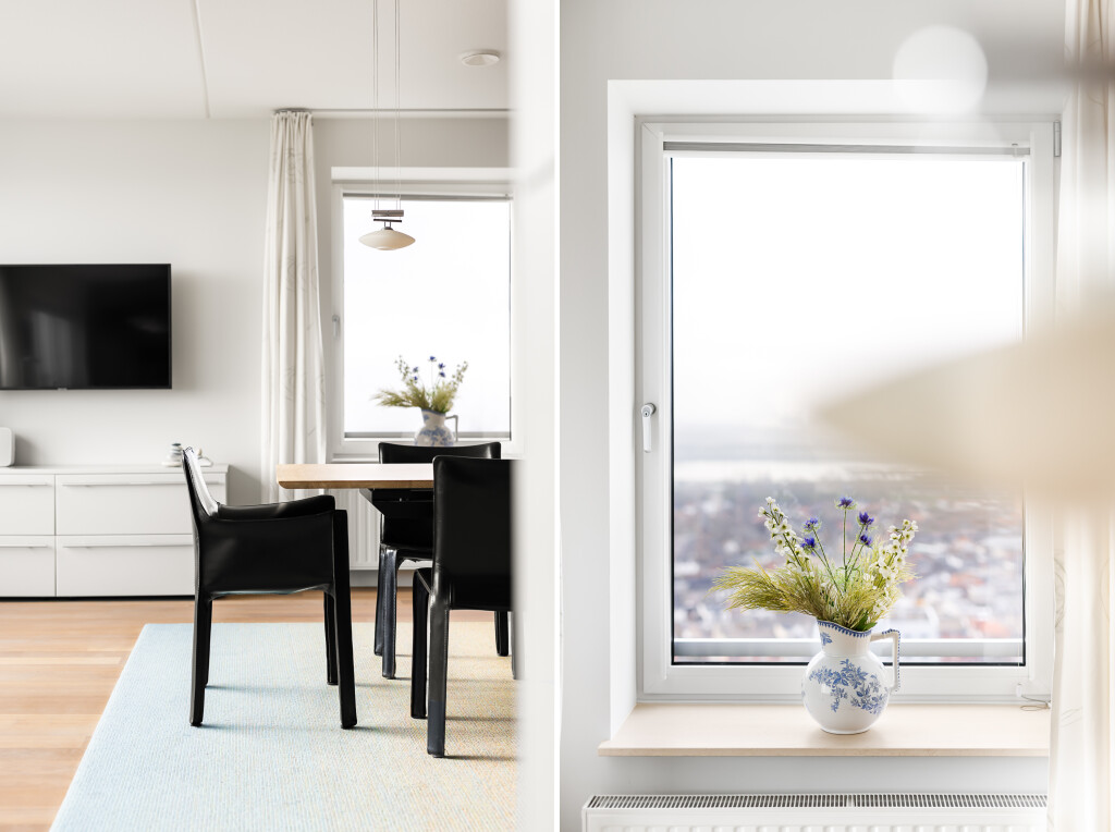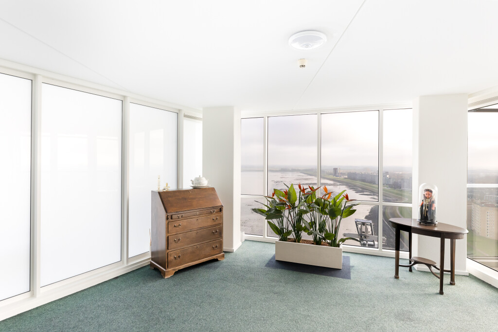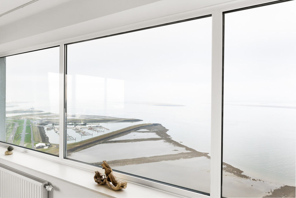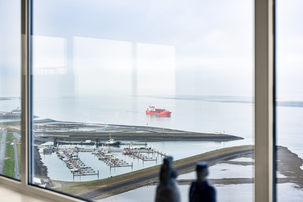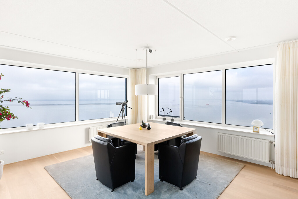 Vanaf het moment dat u binnenkomt, wordt u overweldigd door het licht, de ruimte en het spectaculaire uitzicht. De enorme raampartijen rondom zorgen voor een voortdurend veranderend panorama: voorbijvarende schepen, indrukwekkende wolkenluchten en de schitterende zonsondergangen boven het water.