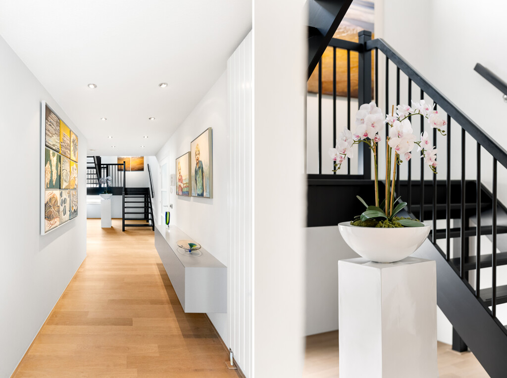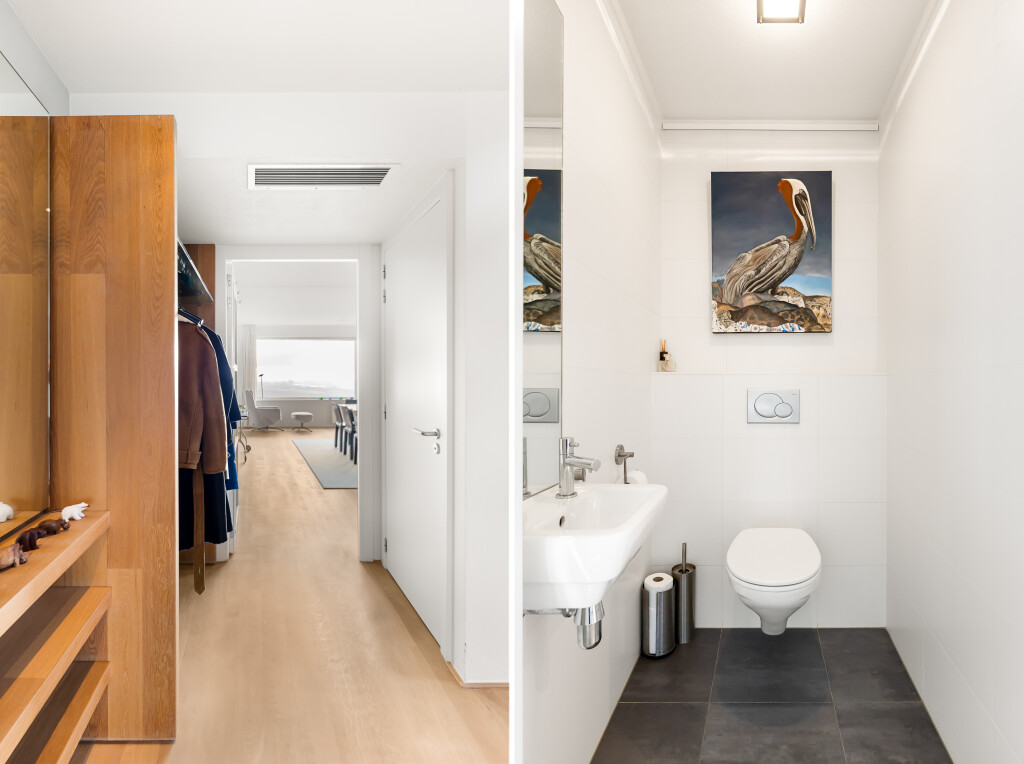 Entree met ruime hal en trapopgang naar bovenste verdieping, videofoon, meterkast, garderoberuimte, toiletruimte met fonteintje en hangtoilet. Vanuit de hal heeft u toegang tot de woonruimte en de keukenruimte.