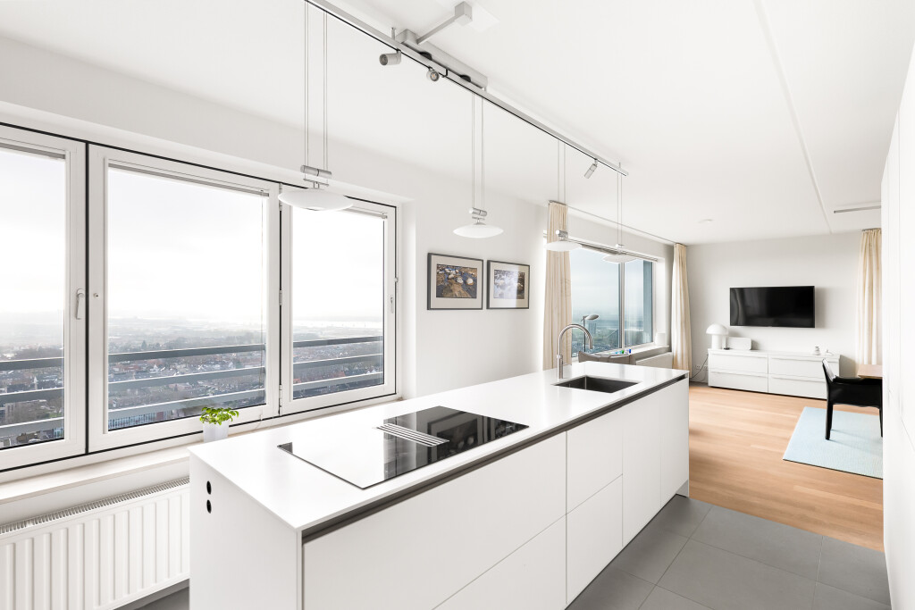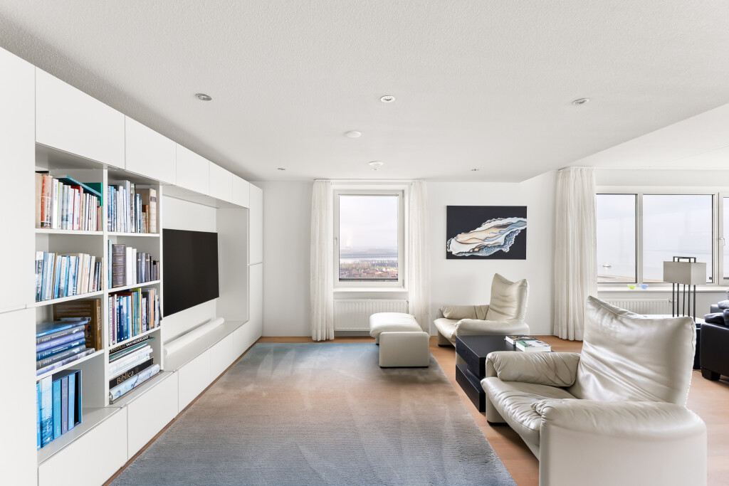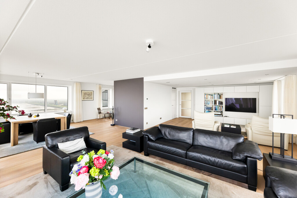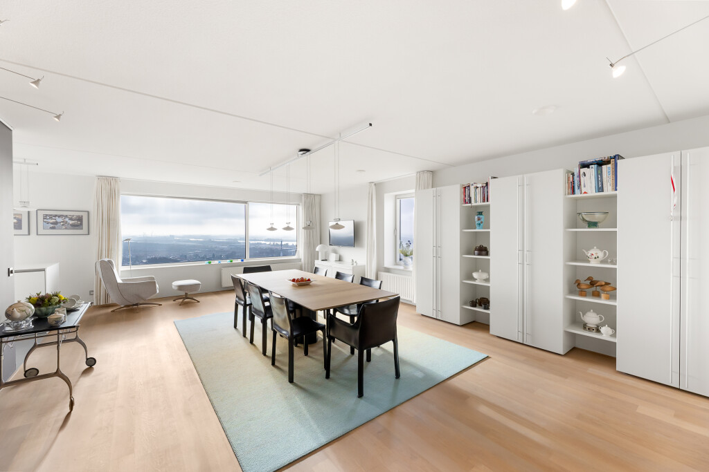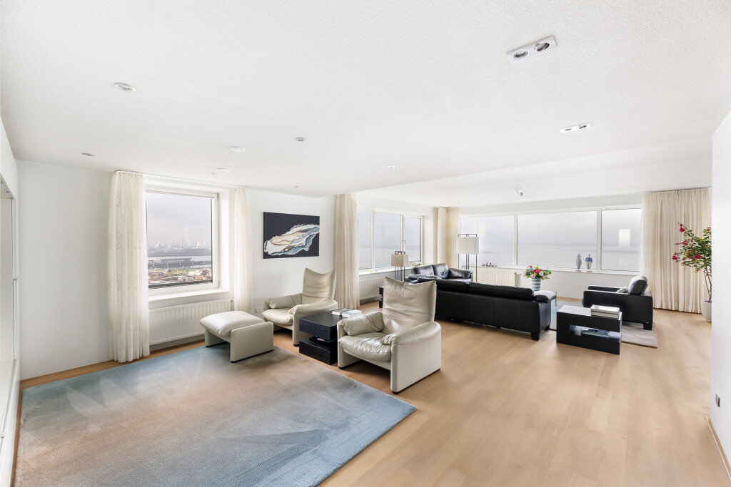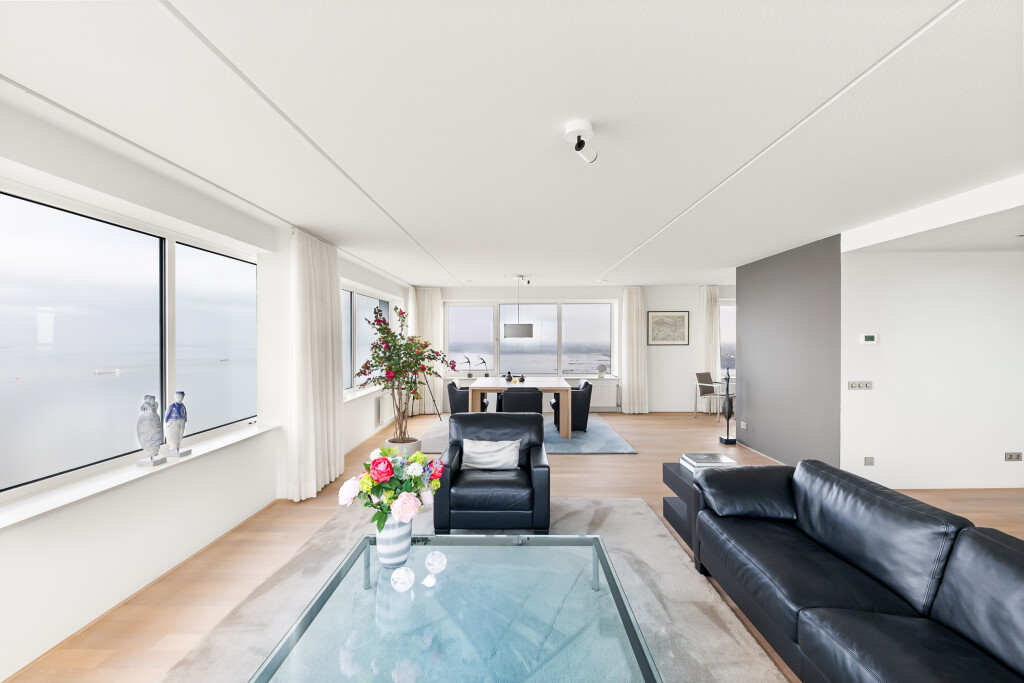 Het penthouse beschikt over een royale living in U-vorm, aan de zijde van de Westerschelde — ideaal voor zowel ontspannen avonden als stijlvolle ontvangsten. De verdiepingshoge ramen verbinden binnen met buiten en laten de ruimte naadloos overvloeien in de omliggende horizon. De vloer is voorzien van een parketvloer. Deze ruimte geeft toegang tot de berging (voorzien van WTW unit en airco bediening) en balkon aan de noord/oostzijde van het gebouw.