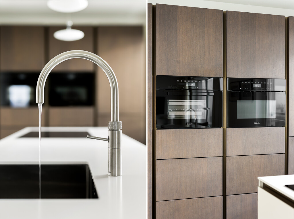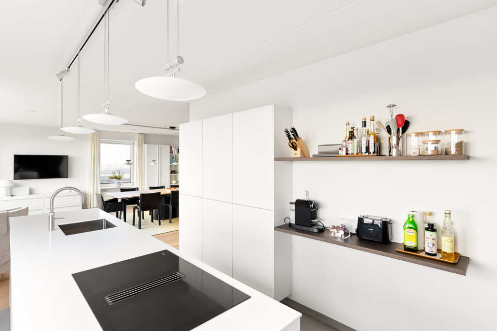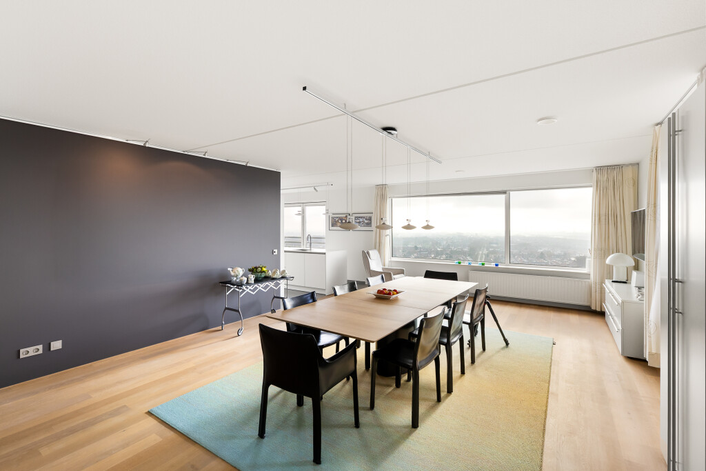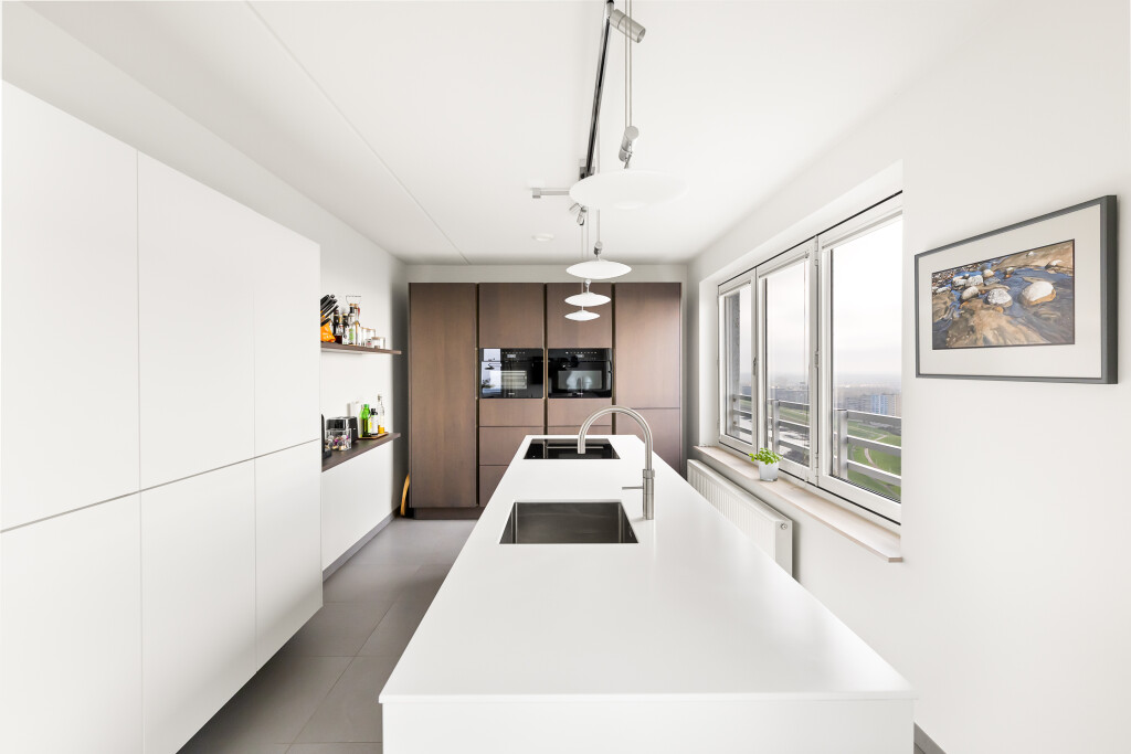 De royale woonkeuken met luxe keukenopstelling (Siemens) is gelegen aan de zuid/westzijde waar u tijdens het koken een fantastisch uitzicht heeft over de stad en het achterland. Het kookeiland is voorzien van een composiet aanrechtblad, spoelbak met Quooker kraan en inductie kookplaat met geïntegreerde afzuiging en vaatwasser. De hoge wandopstelling beschikt o.a. uit een stoomoven en een combimagnetron, een koelkast, vriezer en een wijnkast. De ruimte is voorzien van een parketvloer in de eetkamer, provisiekast. De keukenruimte is voorzien van een raampartij met een openschuivend systeem/vouwwand en tegelvloer.