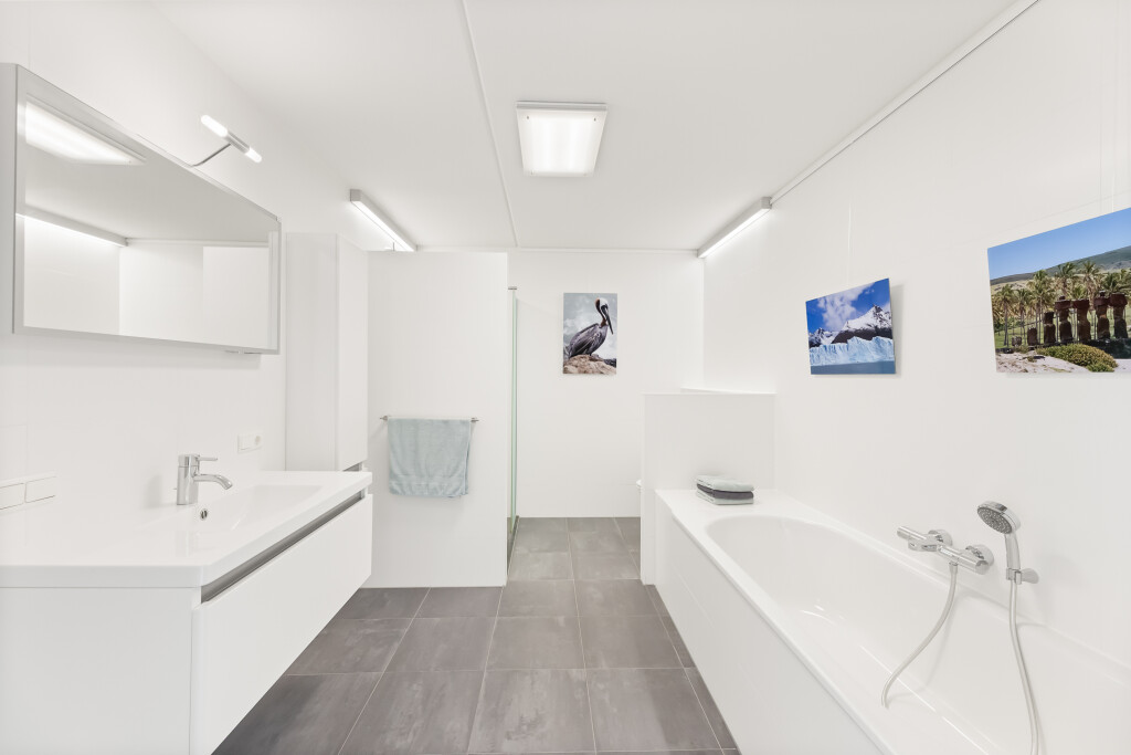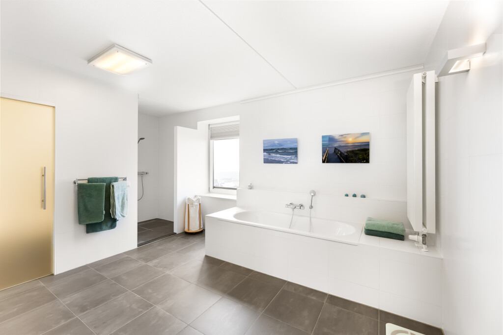 De tweede badkamer is voorzien van een ligbad, inloopdouche, hangtoilet en wastafel met wastafelmeubel.