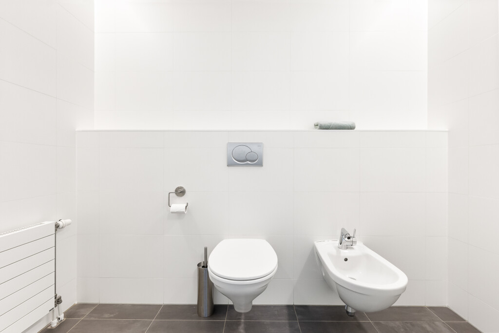 De royale badkamer is direct bereikbaar vanuit de masterkamer, voorzien van een inloopdouche, hangtoilet, bidet, ligbad en meubel met dubbele wastafel.