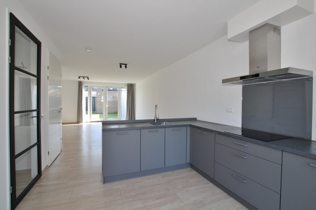 Bij binnenkomst tref je een lichte en ruime woonkamer met een moderne open keuken. De keuken is compleet uitgerust met vaatwasser, inductiekookplaat, combi-oven, koel-/vriescombinatie. De gehele begane grond is voorzien van een waterbestendige laminaatvloer met comfortabele vloerverwarming. Praktisch detail is de trapkast voor extra bergruimte. Via de grote glazen pui heb je direct toegang tot de achtertuin, wat zorgt voor veel lichtinval en een prettige verbinding tussen binnen en buiten.