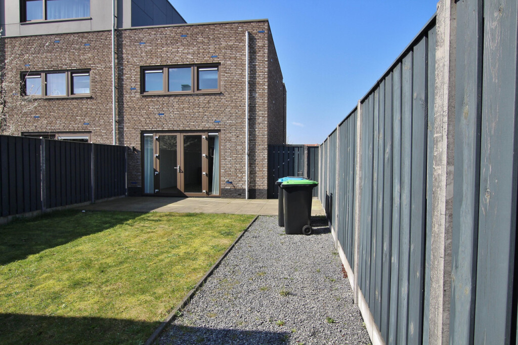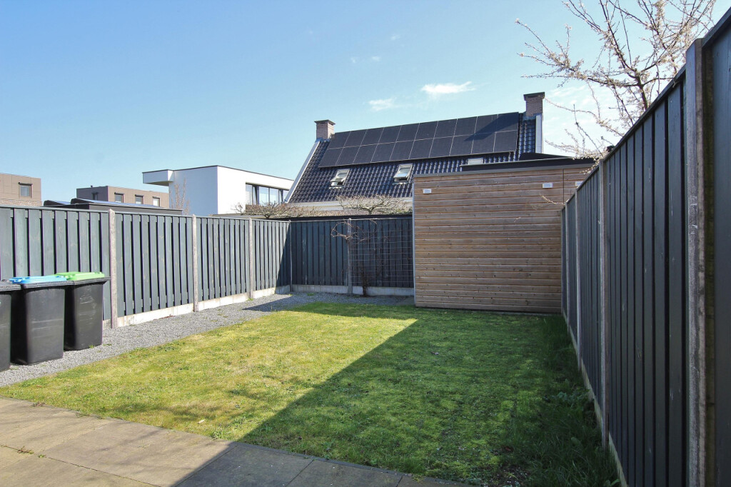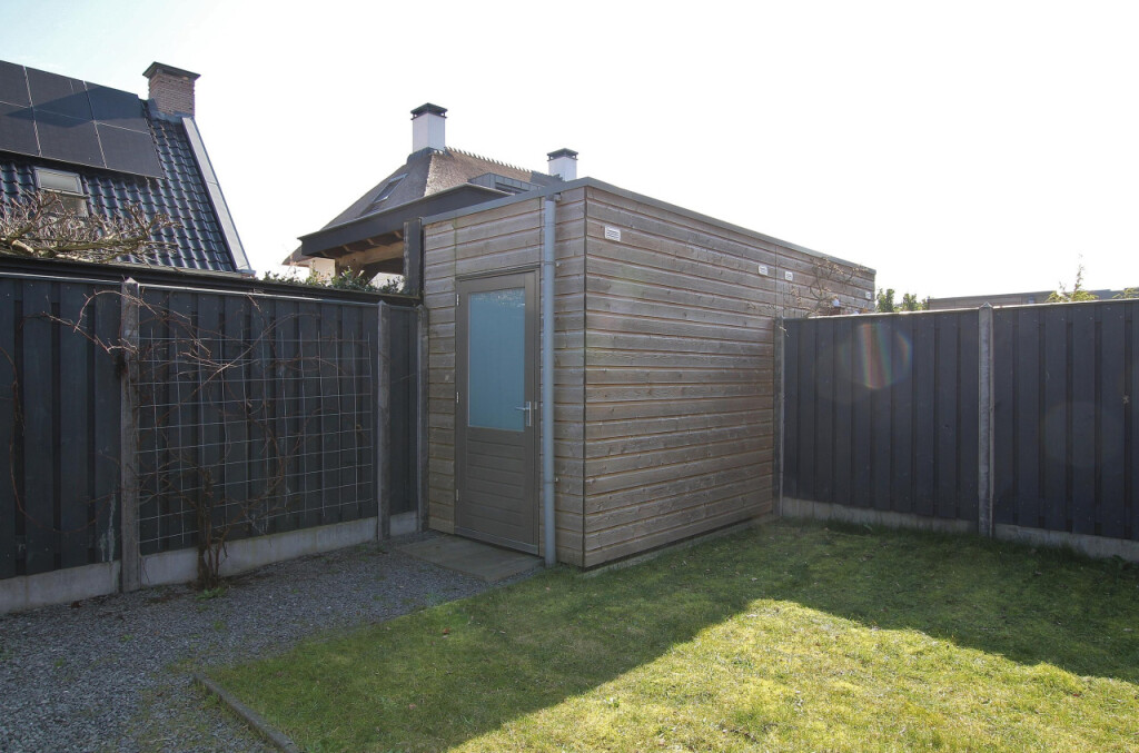 De onderhoudsvriendelijke achtertuin is voorzien van een terras, tuinhuis en een afsluitbare poort.