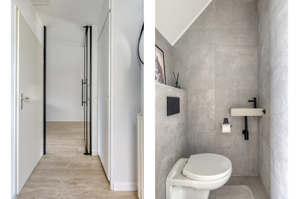 Binnenkomst- in de hal met meterkast, modern hangtoilet met fonteintje en toegang tot de kruipruimte. De vloer in de hal is afgewerkt met een mooie laminaatvloer, die is doorgelegd in de woonkamer, keuken en aanbouw.