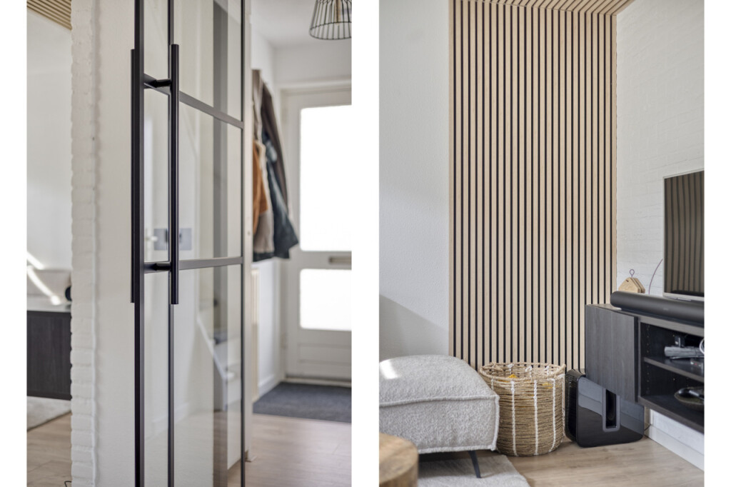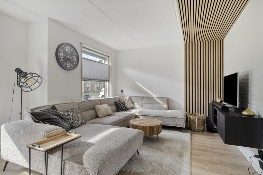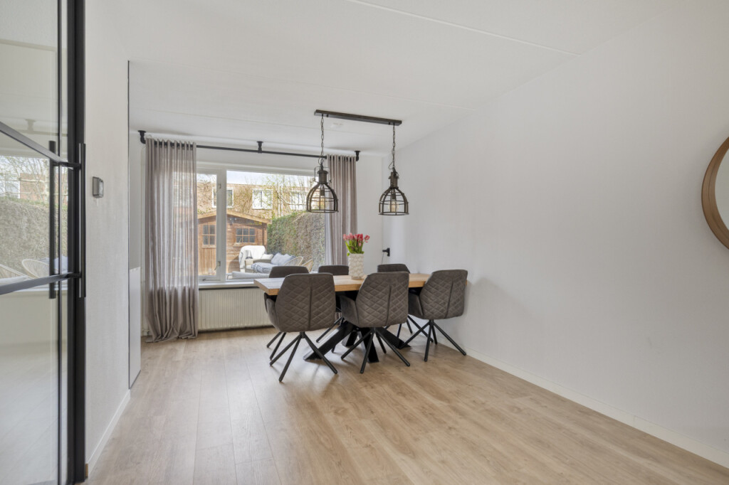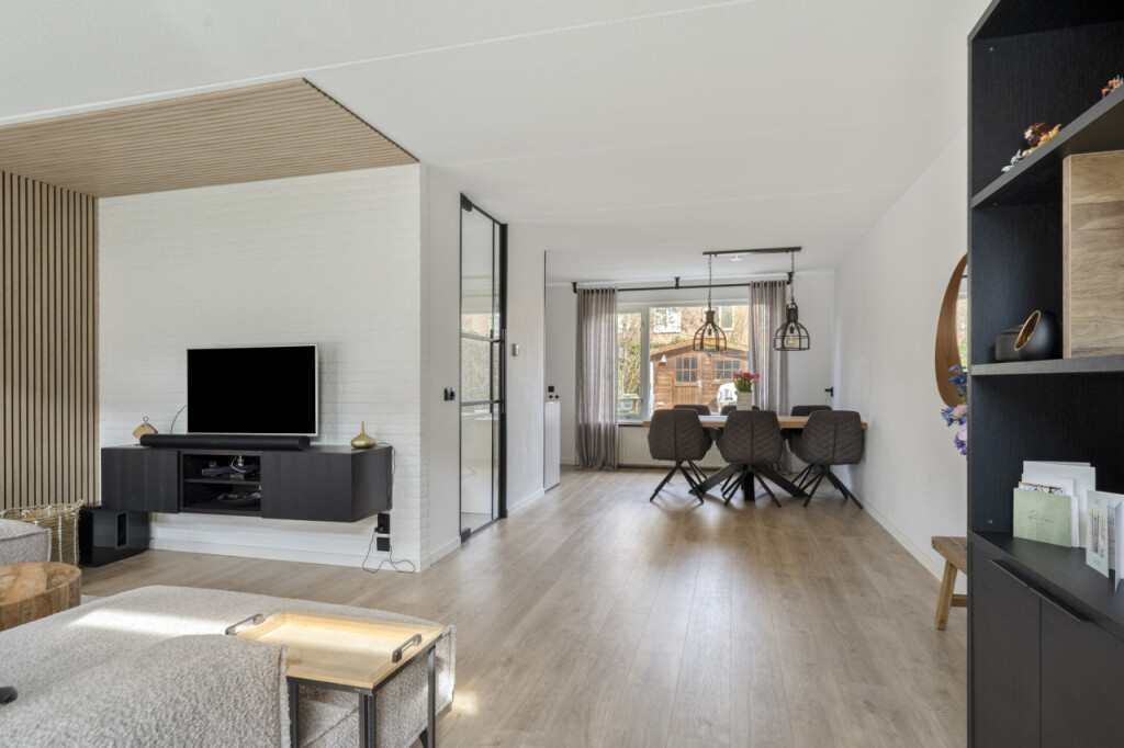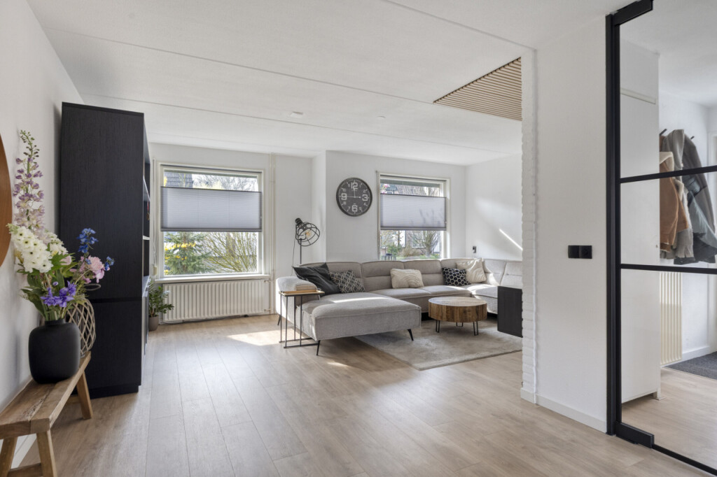 Via de moderne stalen taatsdeur is de lichtrijke L-vormige woonkamer met halfopen keuken en aansluitend, in de aanbouw, de bijkeuken en garage met berging.