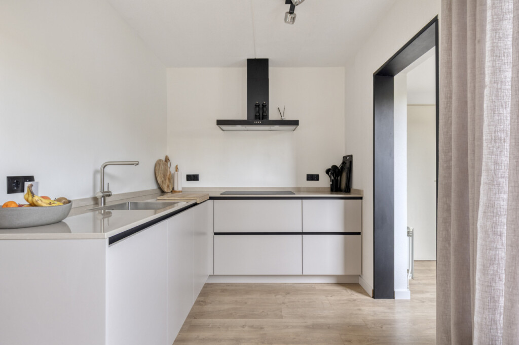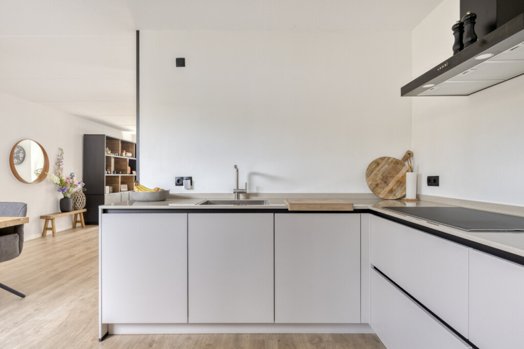 De luxe halfopen keuken (2024) is in hoekopstelling geplaatst en van alle gemakken voorzien. De keuken zelf biedt veel werkruimte en is uitgevoerd met inductiekookplaat, afzuigkap en vaatwasmachine.