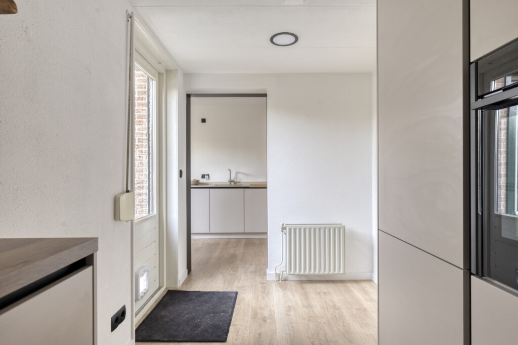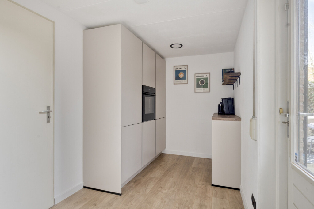 In de ruime bijkeuken is een keukenkast geplaatst, waar de oven en koelkast in verwerkt zijn. Vanuit de bijkeuken is er toegang tot de tuin.