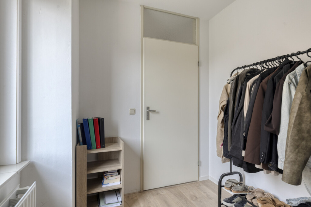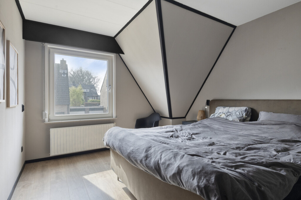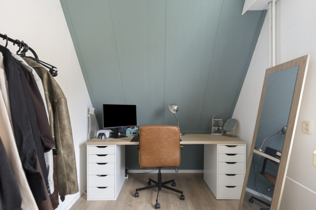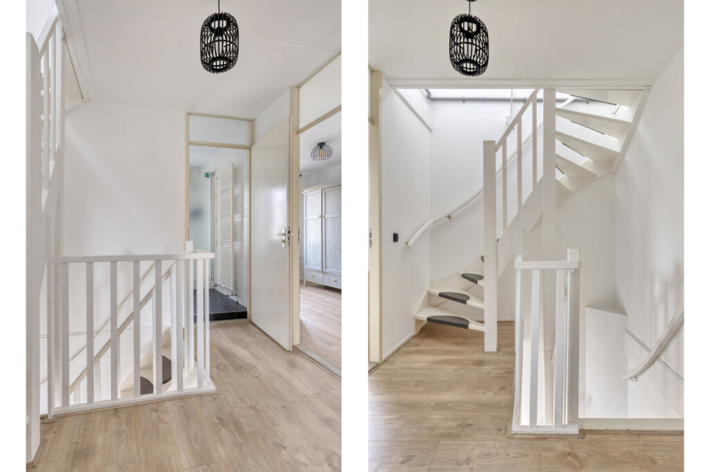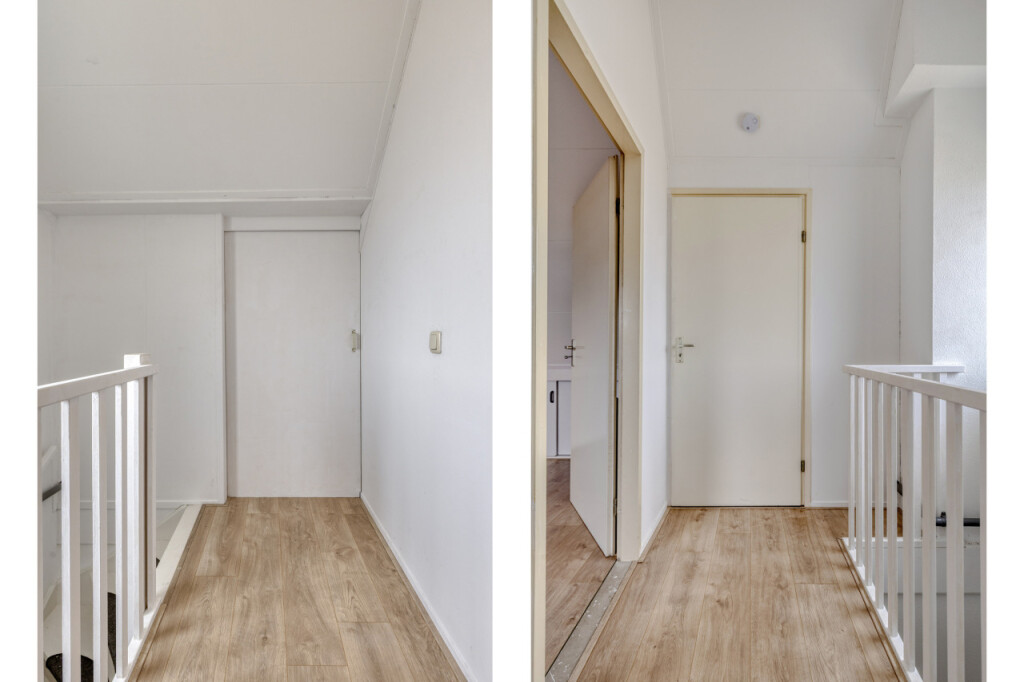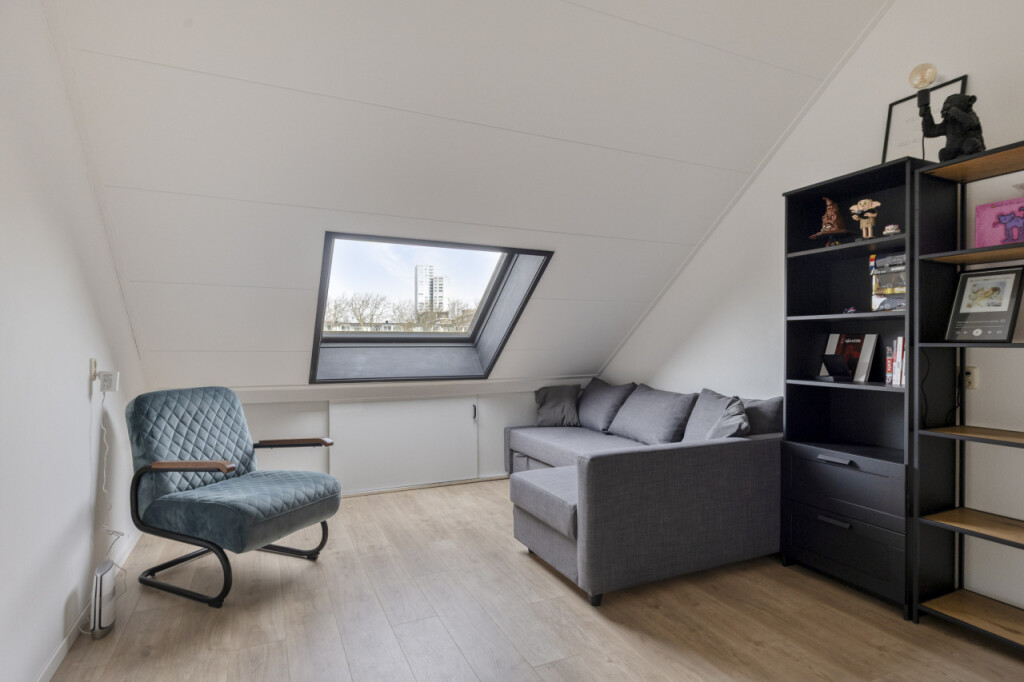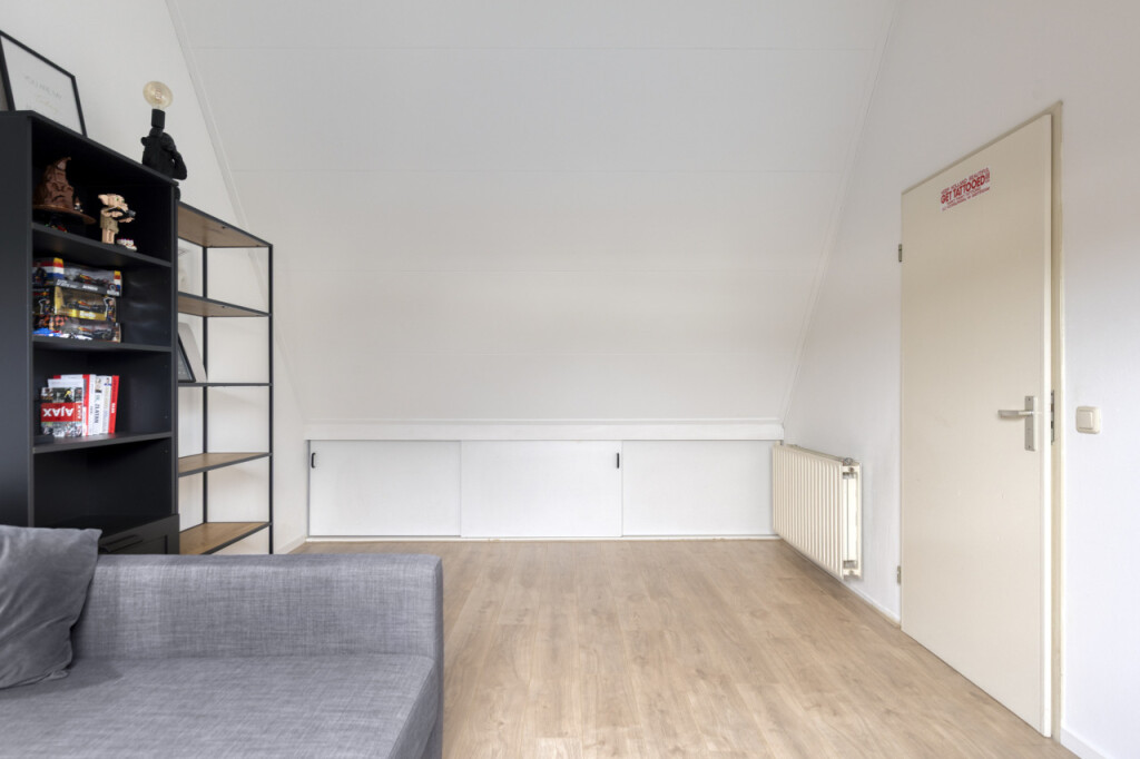 Overloop met cv-ruimte waar de Nefit Proline HR-combiketel (2025) is geplaatst, berging en toegang tot de ruime 4e slaapkamer met dakraam. Achter de knieschotten bevindt zich nog veel praktische bergruimte.