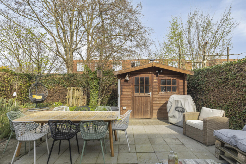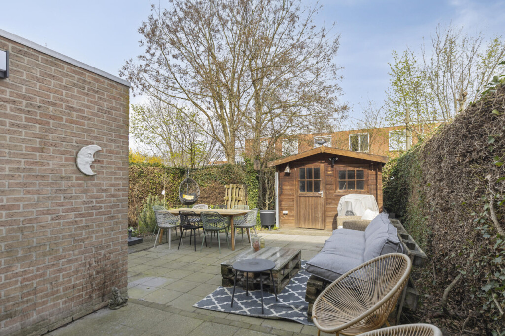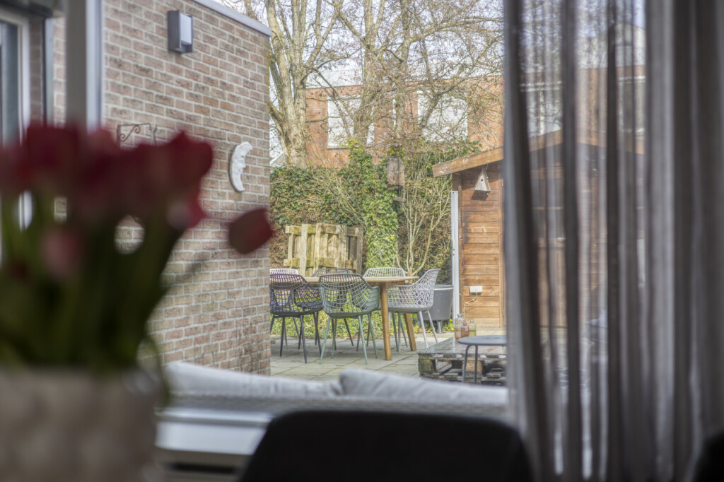 De beschutte tuin op het noordwesten biedt een heerlijke plek om in alle privacy te ontspannen en tot rust te komen. De tuin is netjes aangelegd met terrassen, diverse beplantingen en een tuinhuis en biedt altijd wel een plekje in de zon of schaduw om van het buitenleven te genieten. Via het zijpad langs de garage is de lange oprit met plaats voor twee autoâs en de straat bereikbaar.