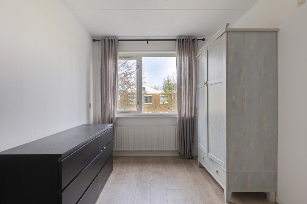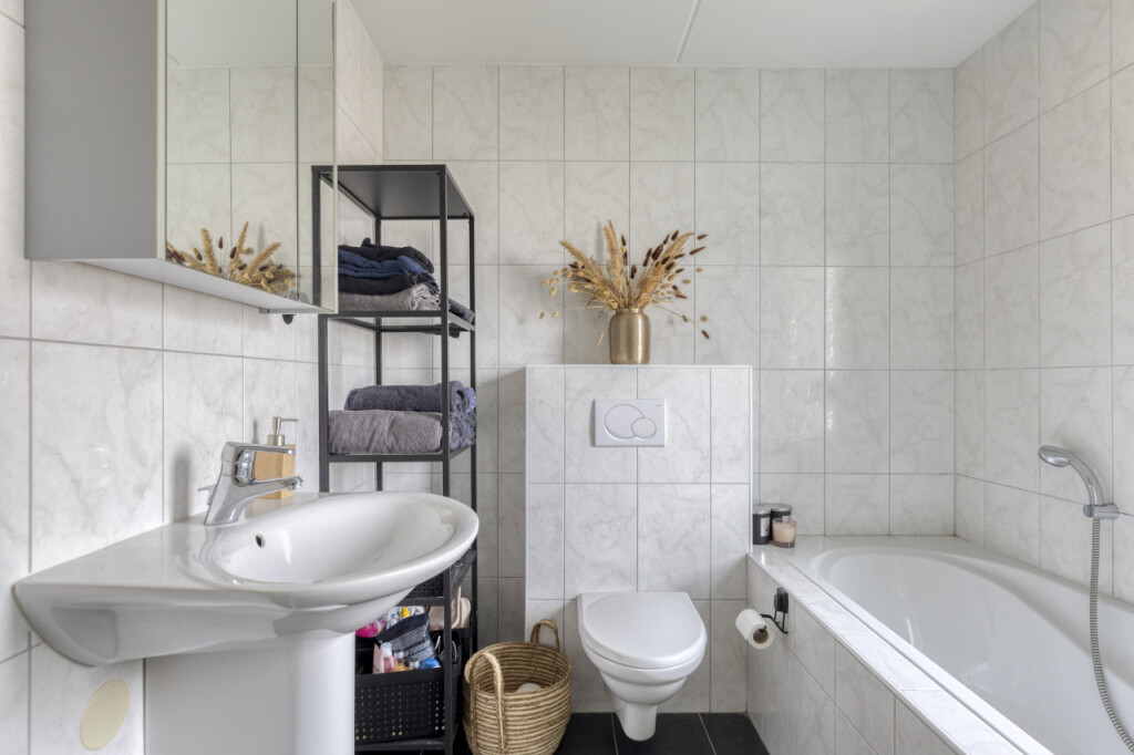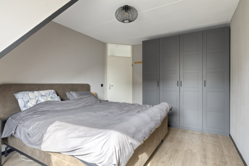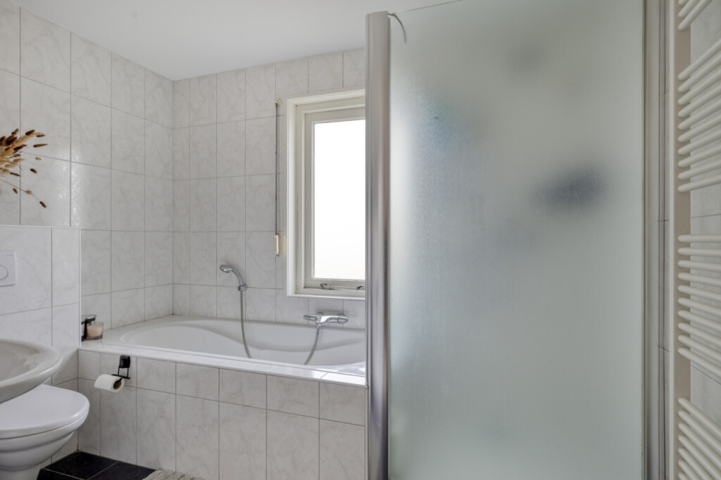 Op de eerste verdieping geeft de overloop toegang tot 3 slaapkamers, de badkamer en de vaste trap naar de 2e verdieping. Ook hier is de vloer afgewerkt met een mooie laminaatvloer. De nette badkamer is volledig betegeld en uitgevoerd met ligbad, douchecabine, hangtoilet en wastafel met spiegelkast.